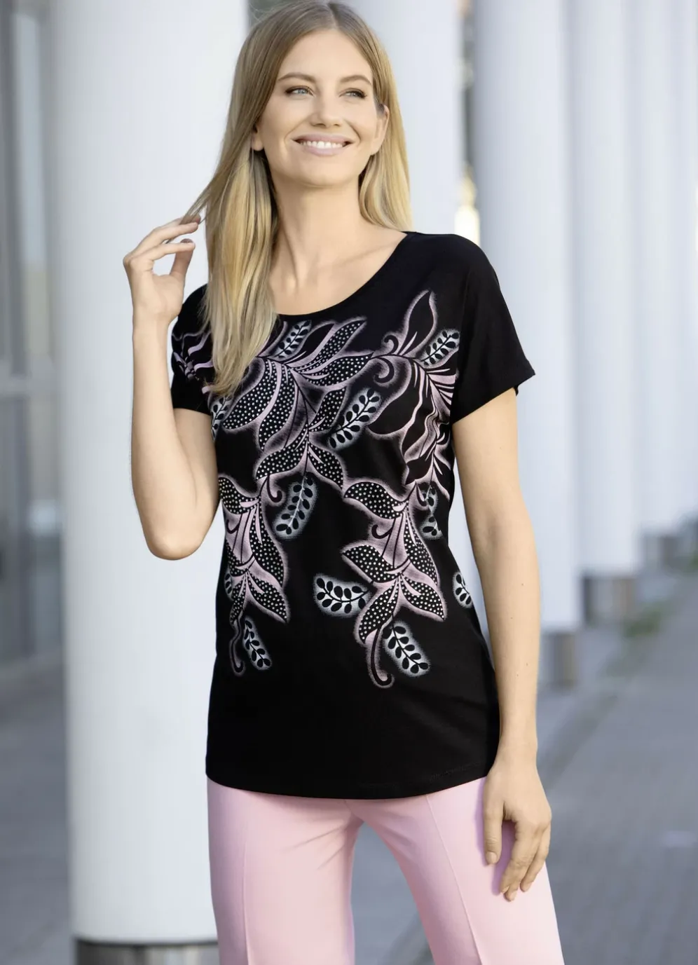 Ansprechendes schwarzes Shirt mit Kontrast-Druck und Strasszier im Vorderteil, überschnittener Schulterpartie sowie leicht abgerundetem Saumabschluss im Vorder- und Rückteil.