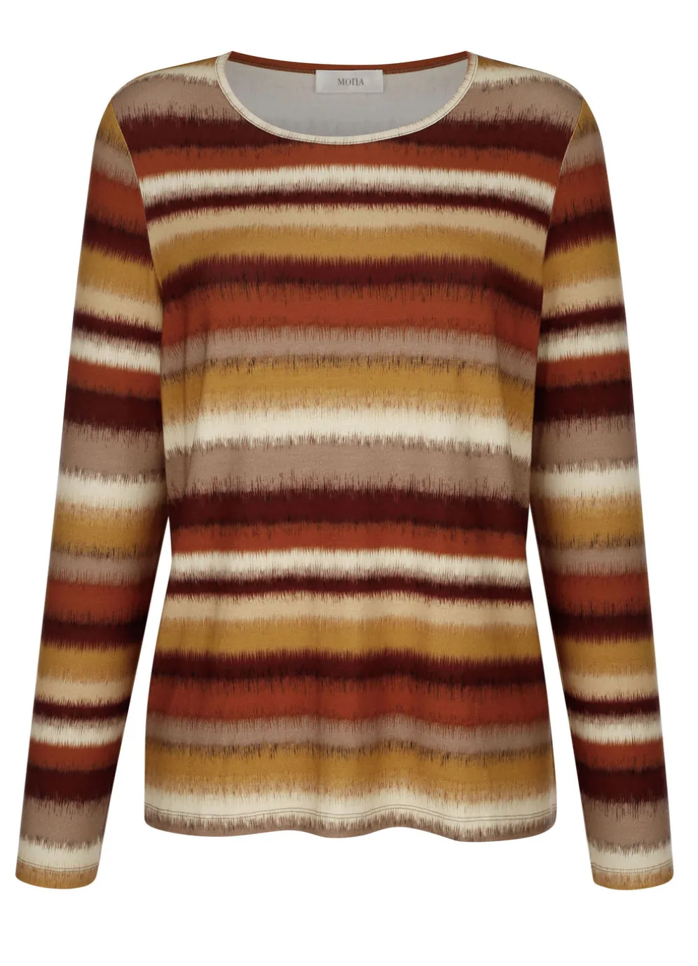 Shirt mit modischem Ringeldessin in Terrakotta-Ocker-Natur und in Größe 52.