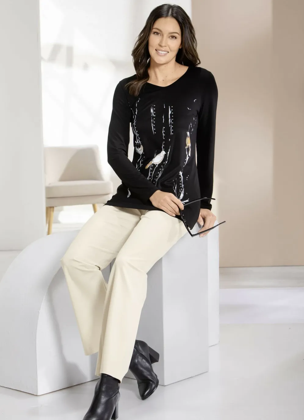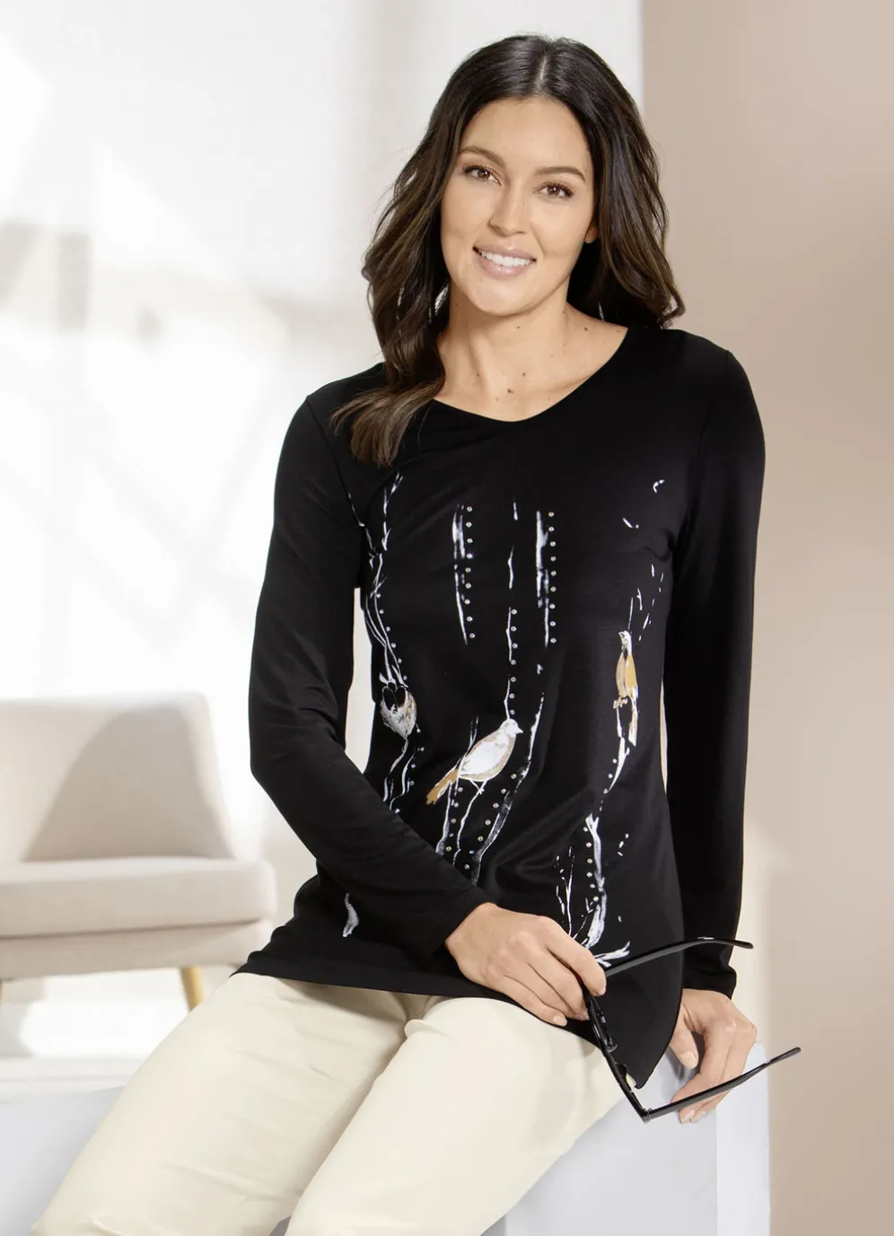 Herrliches, schwarzes Shirt mit platziertem Druck und Ziersteinen im Vorderteil.