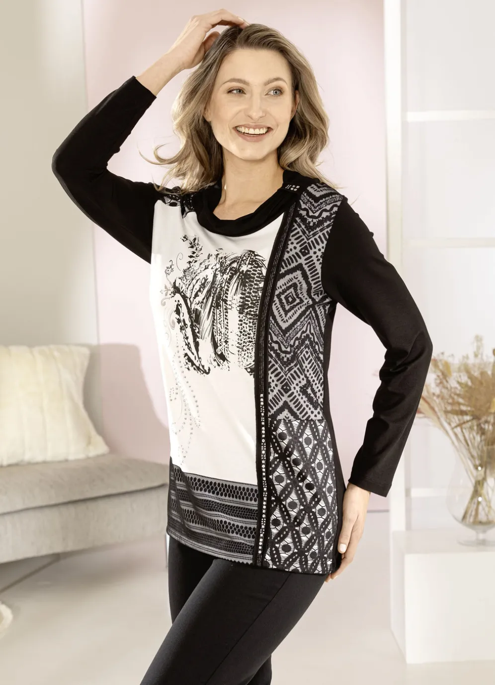 Für den besonderen Charme bei diesem schwarzen Shirt sorgt das schwarz-ecrufarbene Vorderteil mit platziertem Foliendruck, Zierband und Spitzenbesätzen sowie die dekorative Strasszier.