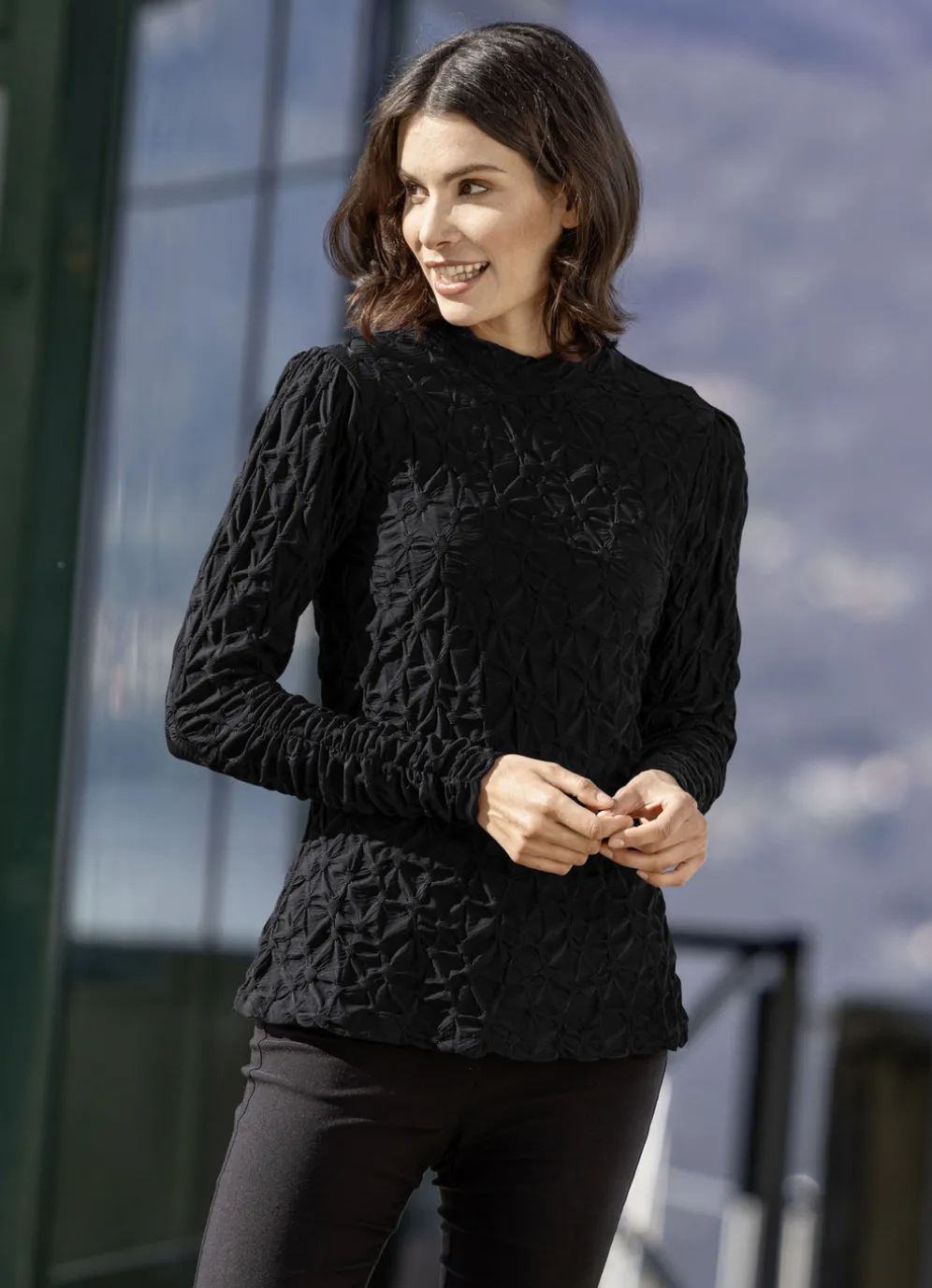 Ein absoluter Blickfang: Bezauberndes Shirt in leicht ausgestellter Form, mit Stehkragen sowie dezenter Raffung durch Gummiband an den langen Ärmeln.