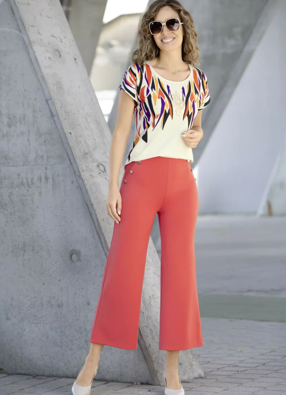 Einzigartiges Shirt in Beige mit schwarz-lila-orangefarbenem Druck, Strass- und Plättchenzier im Vorderteil sowie überschnittener Schulterpartie.