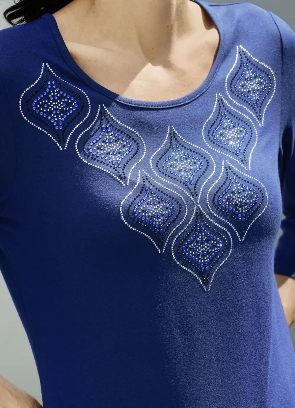 Feminines Shirt in Royalblau mit Strasszier im Vorderteil.
