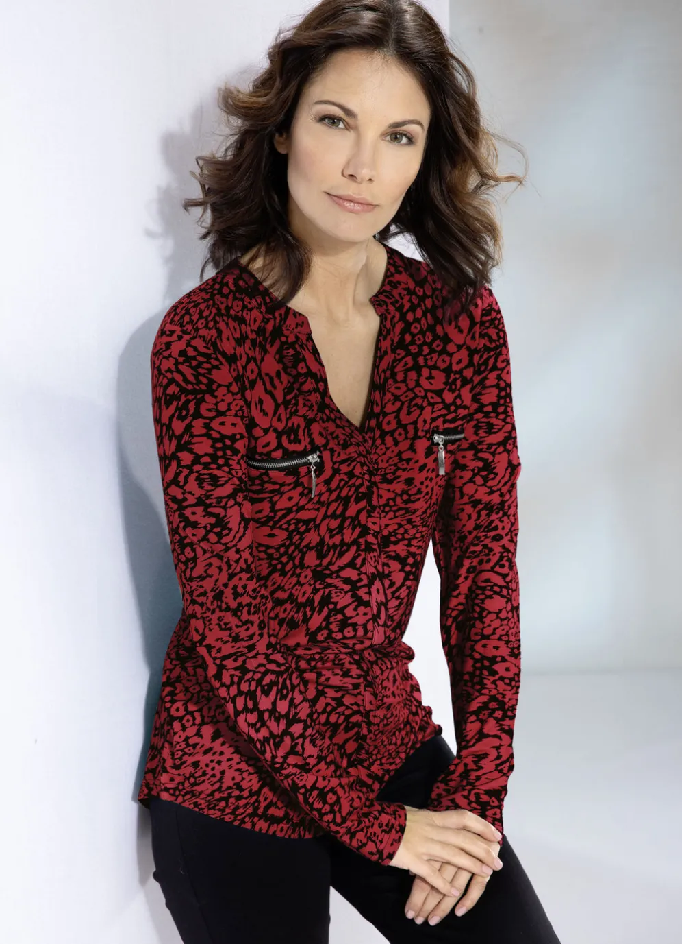 Das absolute Highlight ist dieses allover dessinierte Shirt mit V-Schlitz und Zierblende, angedeuteten Brusttaschen mit Reißverschluss im Vorderteil sowie abgerundetem Saumabschluss im Vorder- und Rückteil.