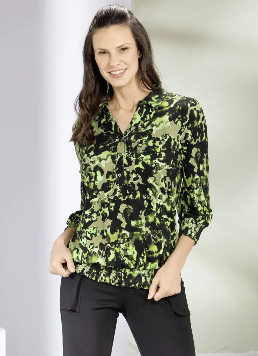 Schicke Shirt-Tunika in Schwarz-Oliv-Kiwi-Bunt, mit farbbrillantem Druck, aparter Kragenlösung, kurzer Knopfleiste, elastisch gesmokten Abschlüssen an den 3/4-langen Ärmeln sowie rundum gesmoktem Saumabschluss.