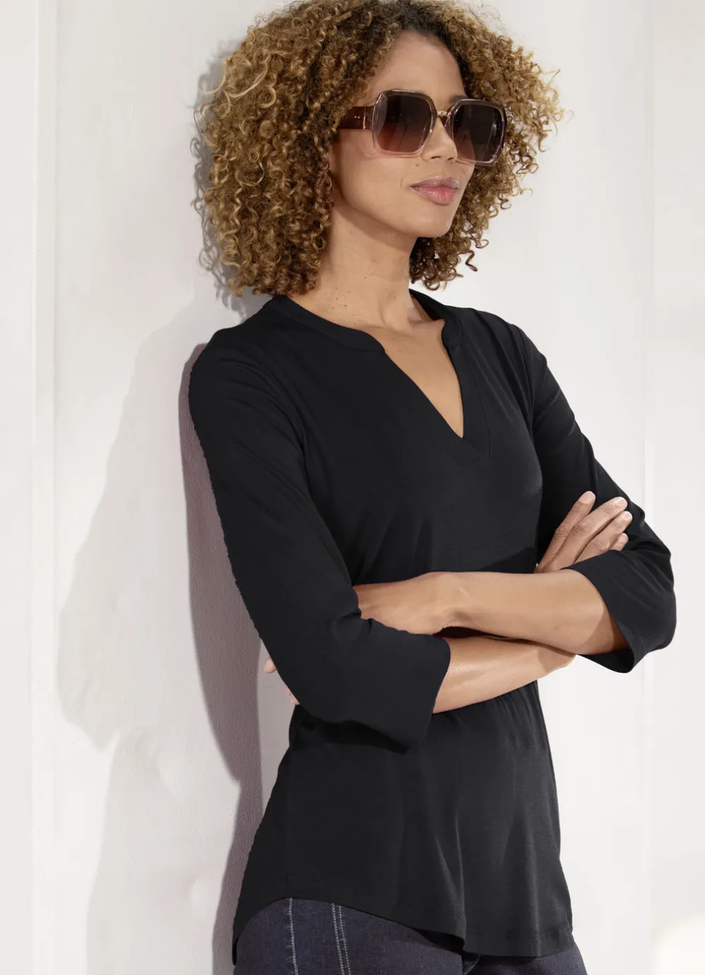 Kombistarke Shirt-Tunika mit kurzem Schlitz am Stehkragen, 3/4-langen Ärmeln sowie abgerundetem Saum.