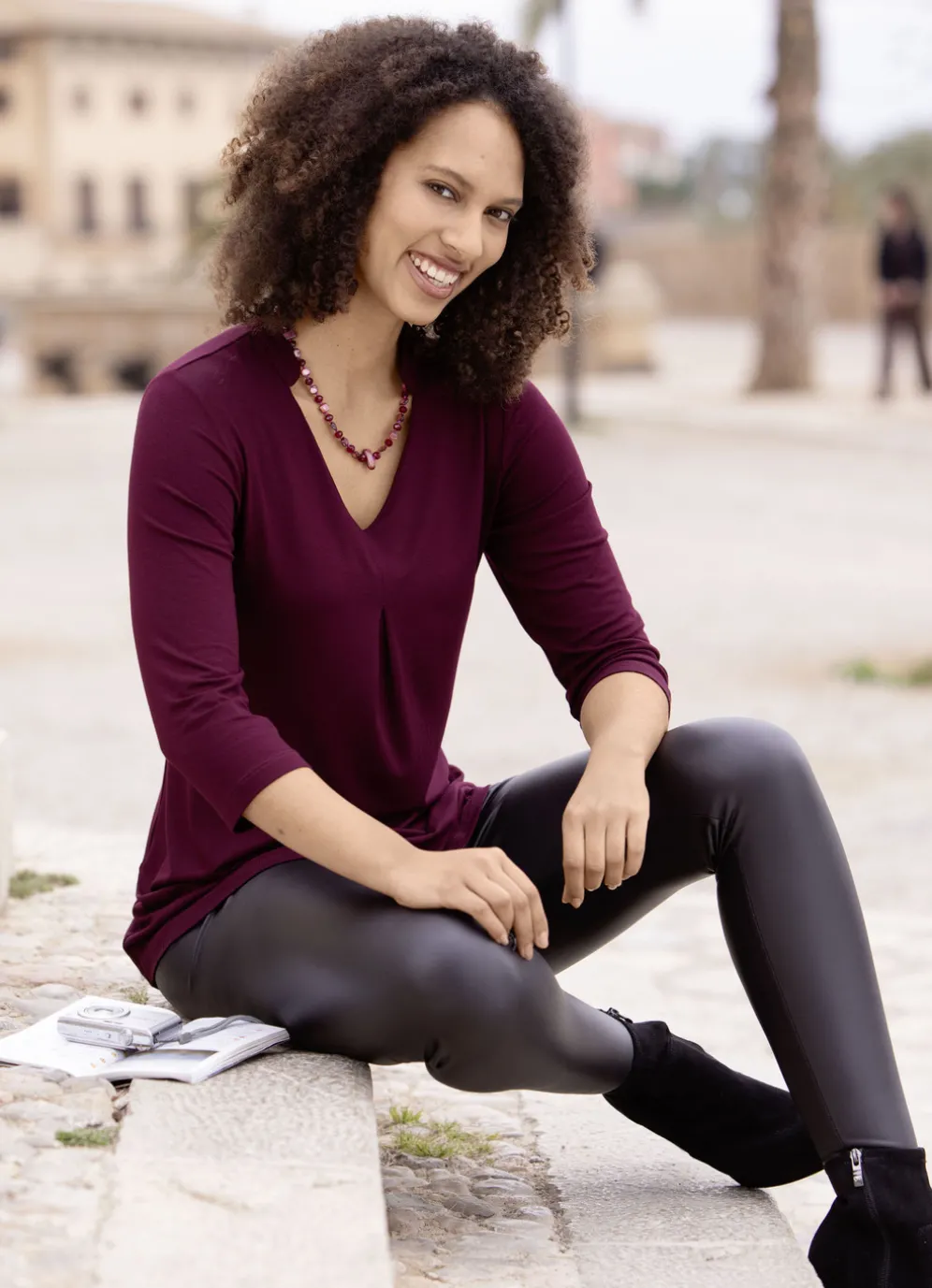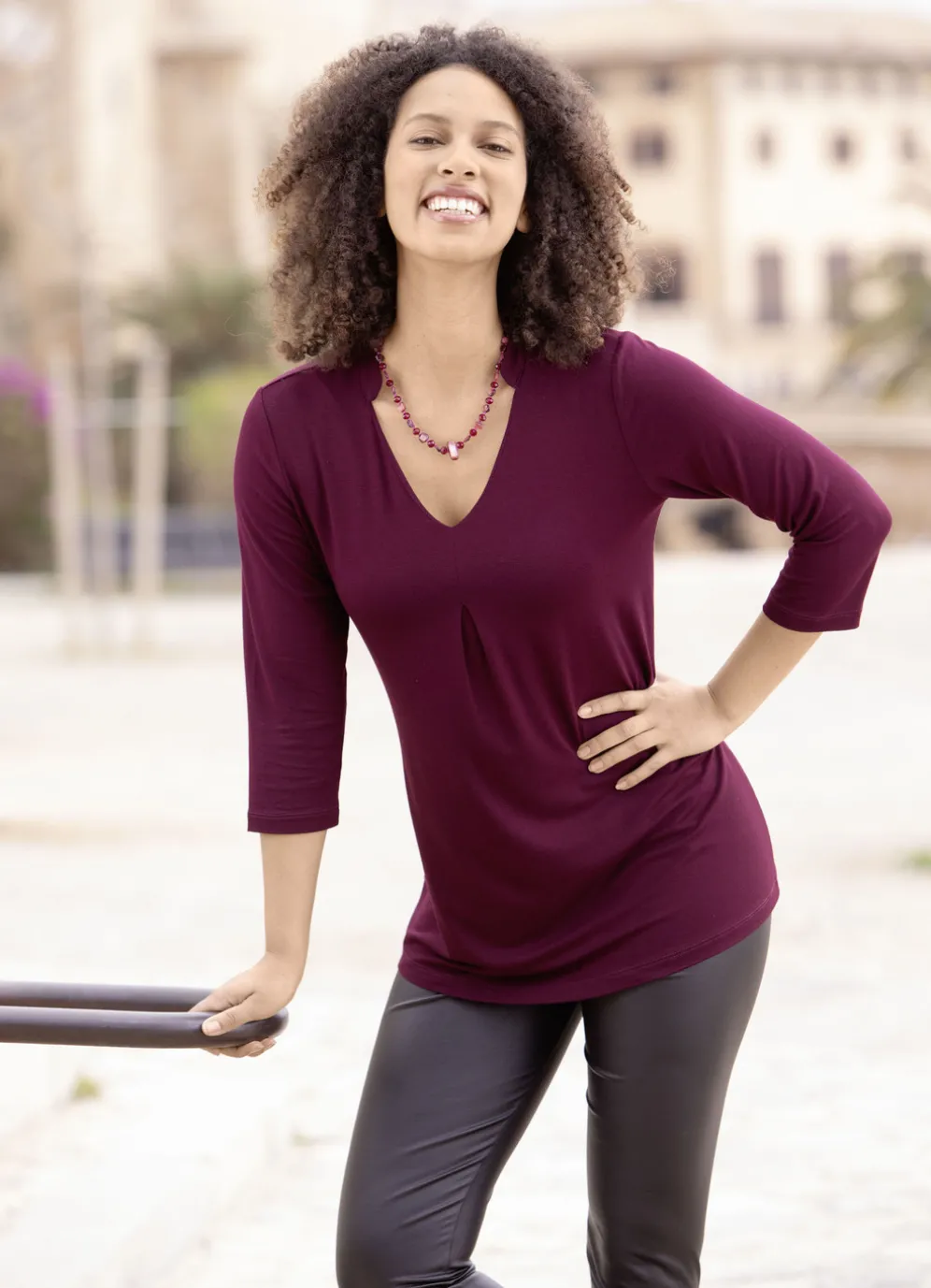 Shirt-Tunika mit V-Ausschnitt in Bordeaux und in Größe 36.