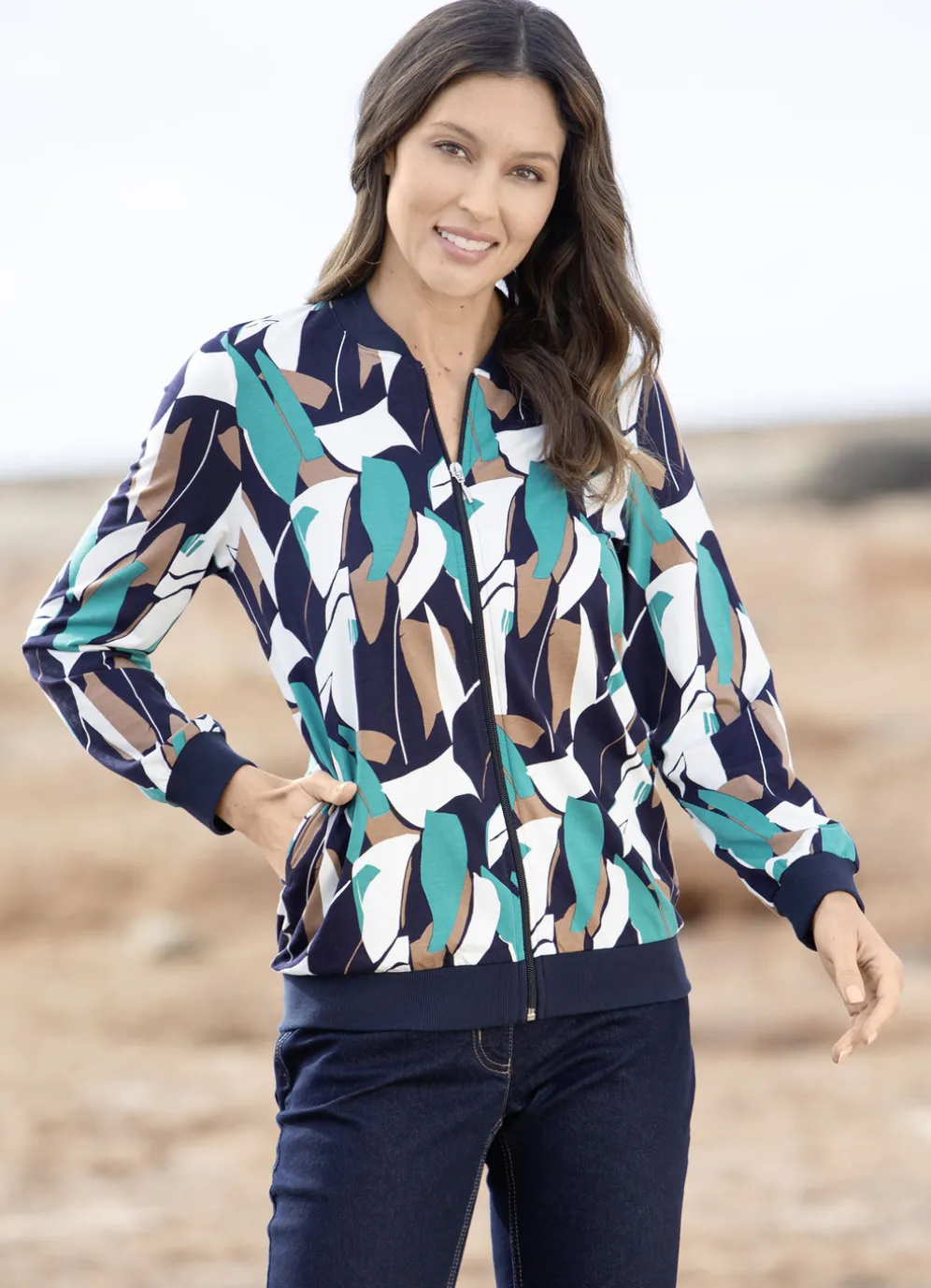 Jedes Teil ein Unikat! Shirtjacke in Ecru-Marine-Petrol, durchgehendem Reißverschluss, seitliche Eingrifftaschen sowie Bündchen-Abschlüssen.