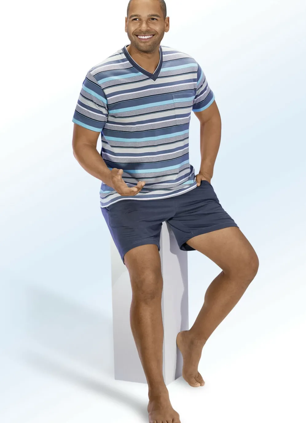 Shorty zum Träumen: Oberteil mit V-Ausschnitt, garngefärbtem Ringeldessin in Grafit-Türkis-Sand, aufgesetzter Brusttasche und innerem Rückensattel. Shorts in Grafit mit Dehnbund und Seitentaschen.