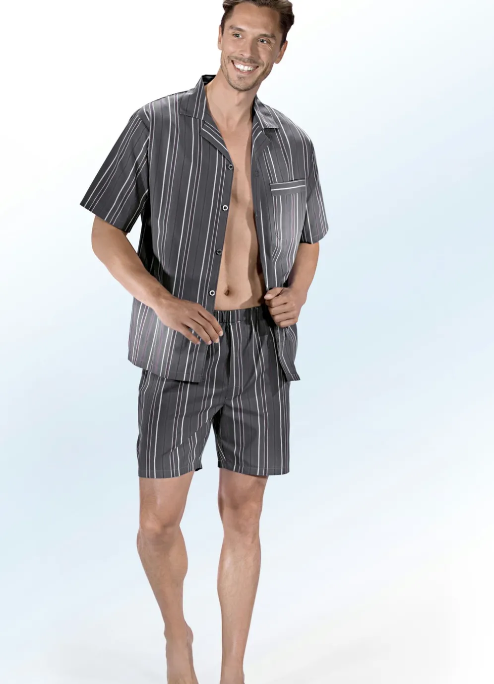 Shorty mit attraktivem Webstreifendessin: durchgeknöpftes Oberteil mit Reverskragen sowie aufgesetzter Brusttasche. Shorts mit auswechselbarem Gummizug im Bund, Seitentaschen und knöpfbarem Eingriff.