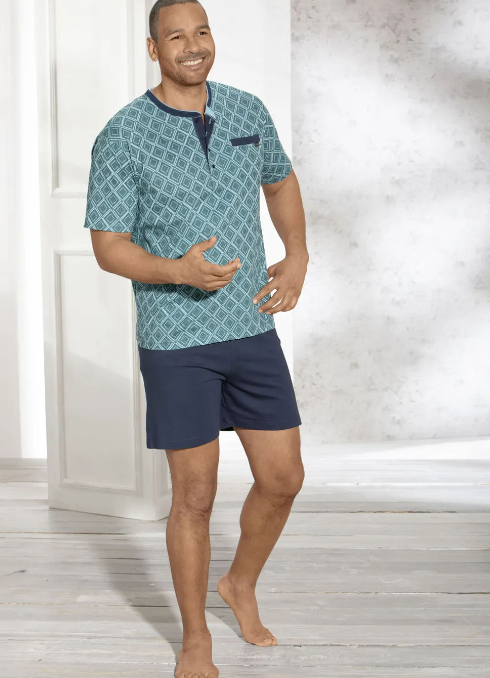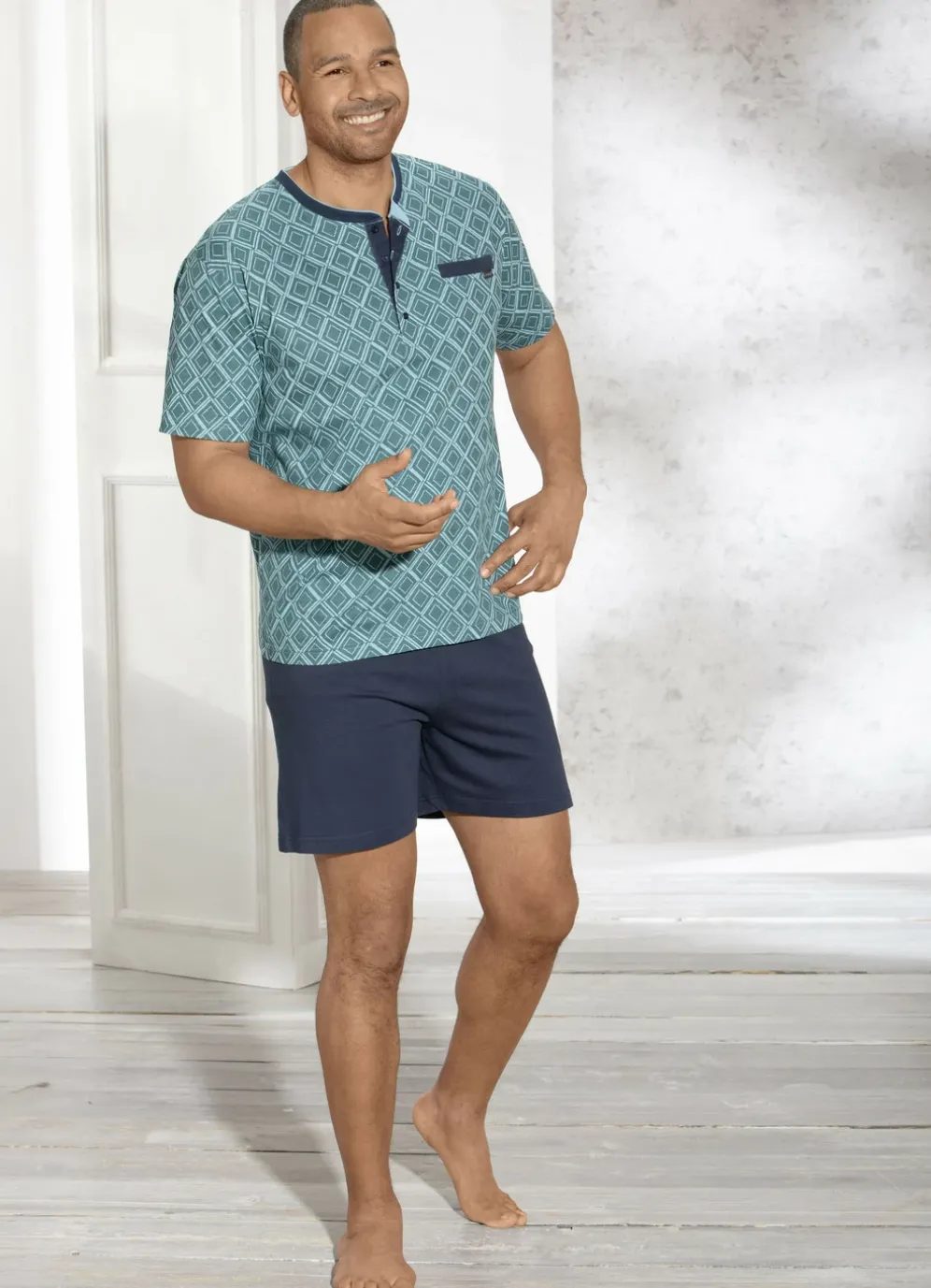 Legeres Shorty: allover dessiniertes Oberteil in Petrol-Mint, mit Knopfleiste sowie eingearbeiteter