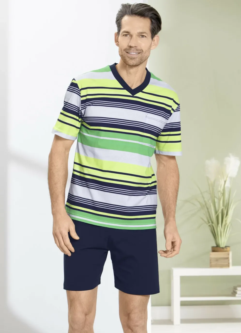 Pfiffiges Shorty mit Ringeldessin in Limette-Grün-Bunt, V-Ausschnitt sowie aufgesetzter Brusttasche. Dazu passend die marinefarbene Shorts mit Gummizug im Bund.