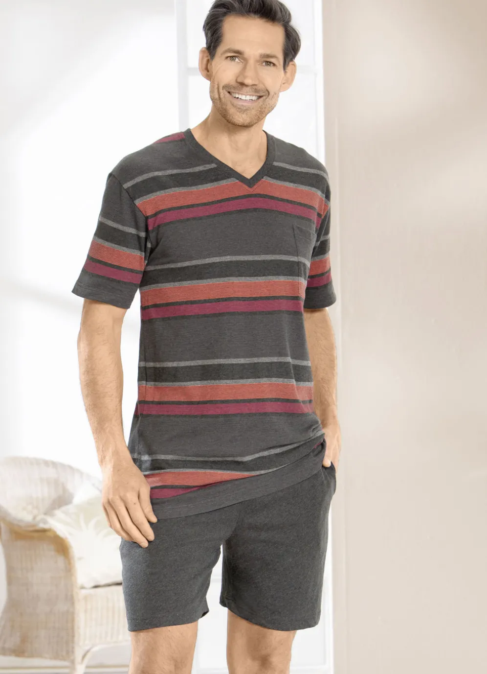 Sommerliches Shorty! Oberteil in Anthrazit meliert-Orange mit garngefärbtem Ringeldessin, V-Ausschnitt, aufgesetzter Brusttasche sowie innerem Rückensattel. Shorts in Anthrazit meliert mit Dehnbund und Seitentaschen.