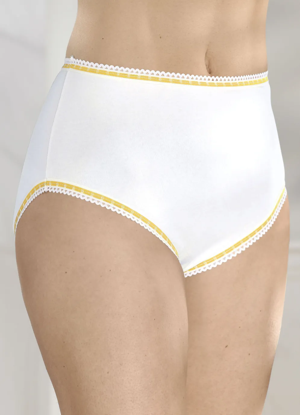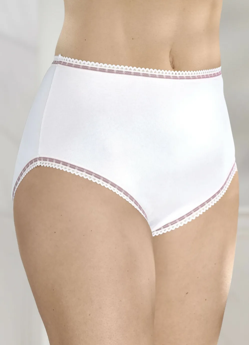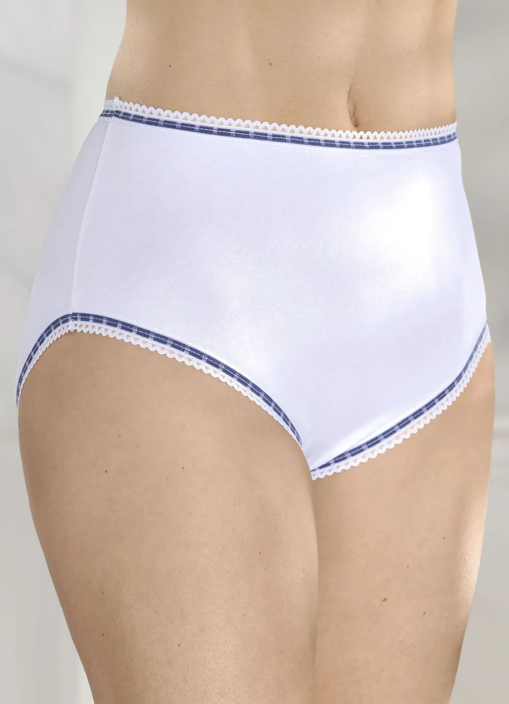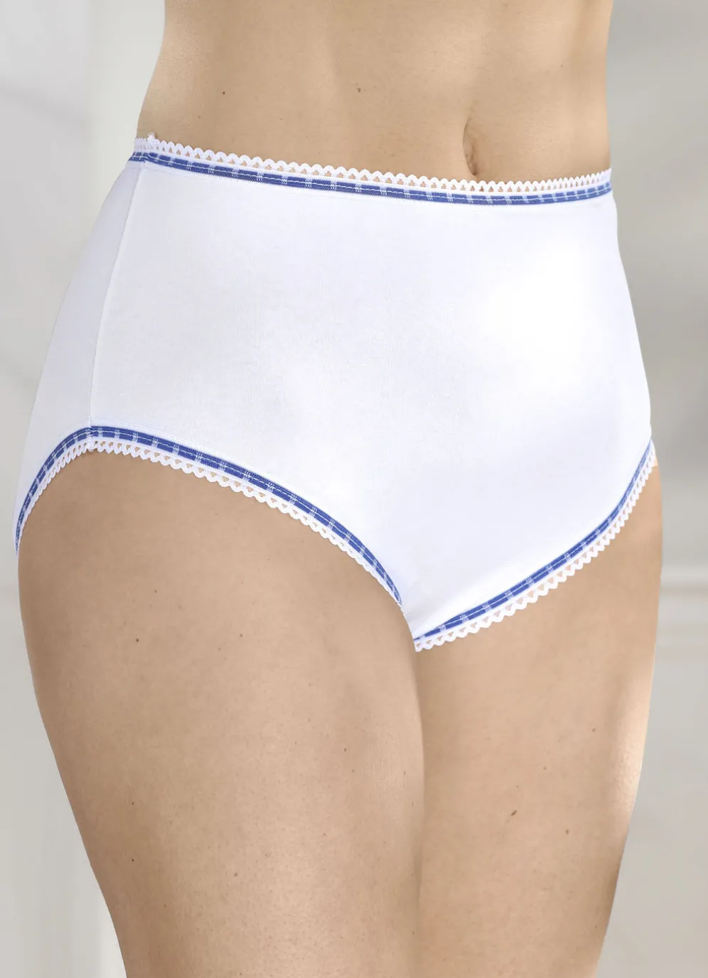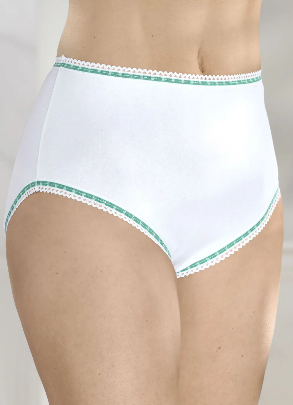 Weißer Slip mit kontrastfarbenen, elastischen Abschlüssen.