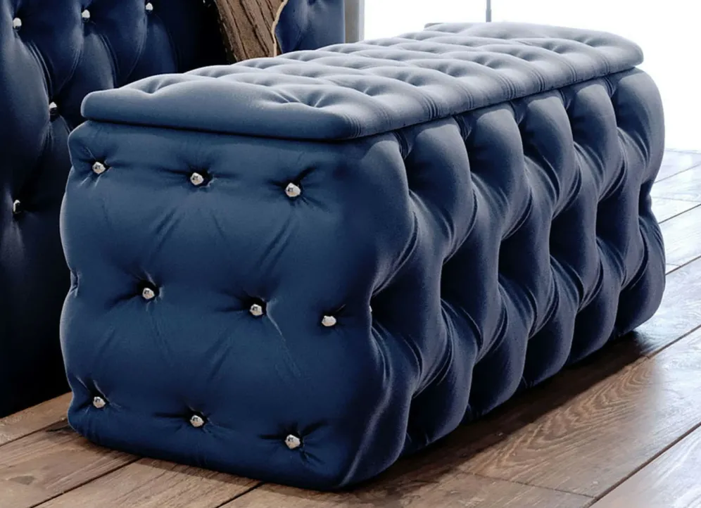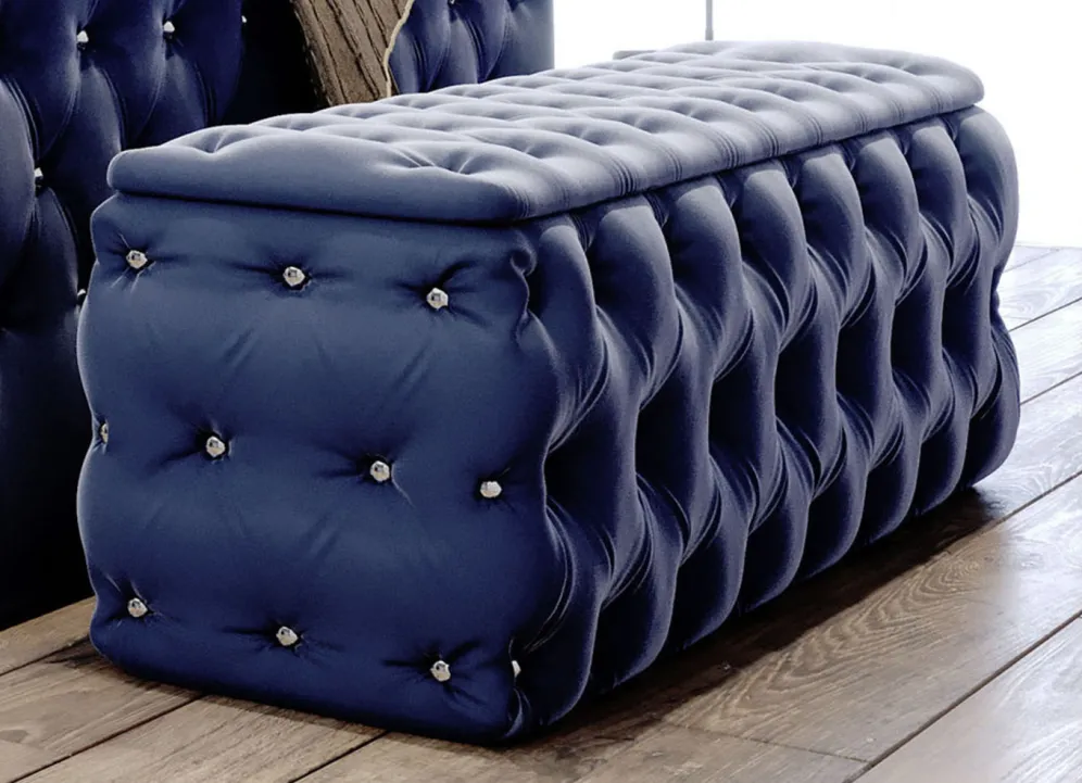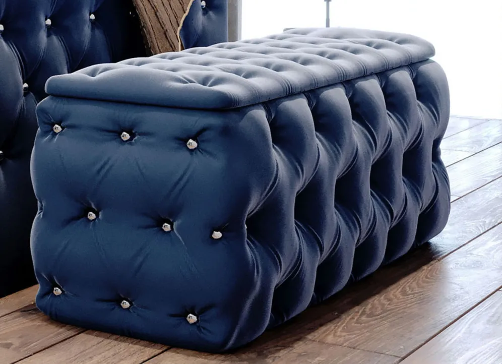 Sitztruhe mit Steppung und Strasssteinen in der Breite von 128 cm und in Dunkelblau.