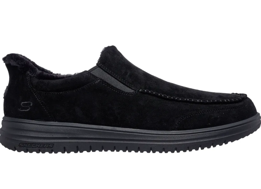 SKECHERS, bequeme Herren-Slipper, mit geformter Slip-Ins Fersenplatte in Schwarz und in Größe 45.