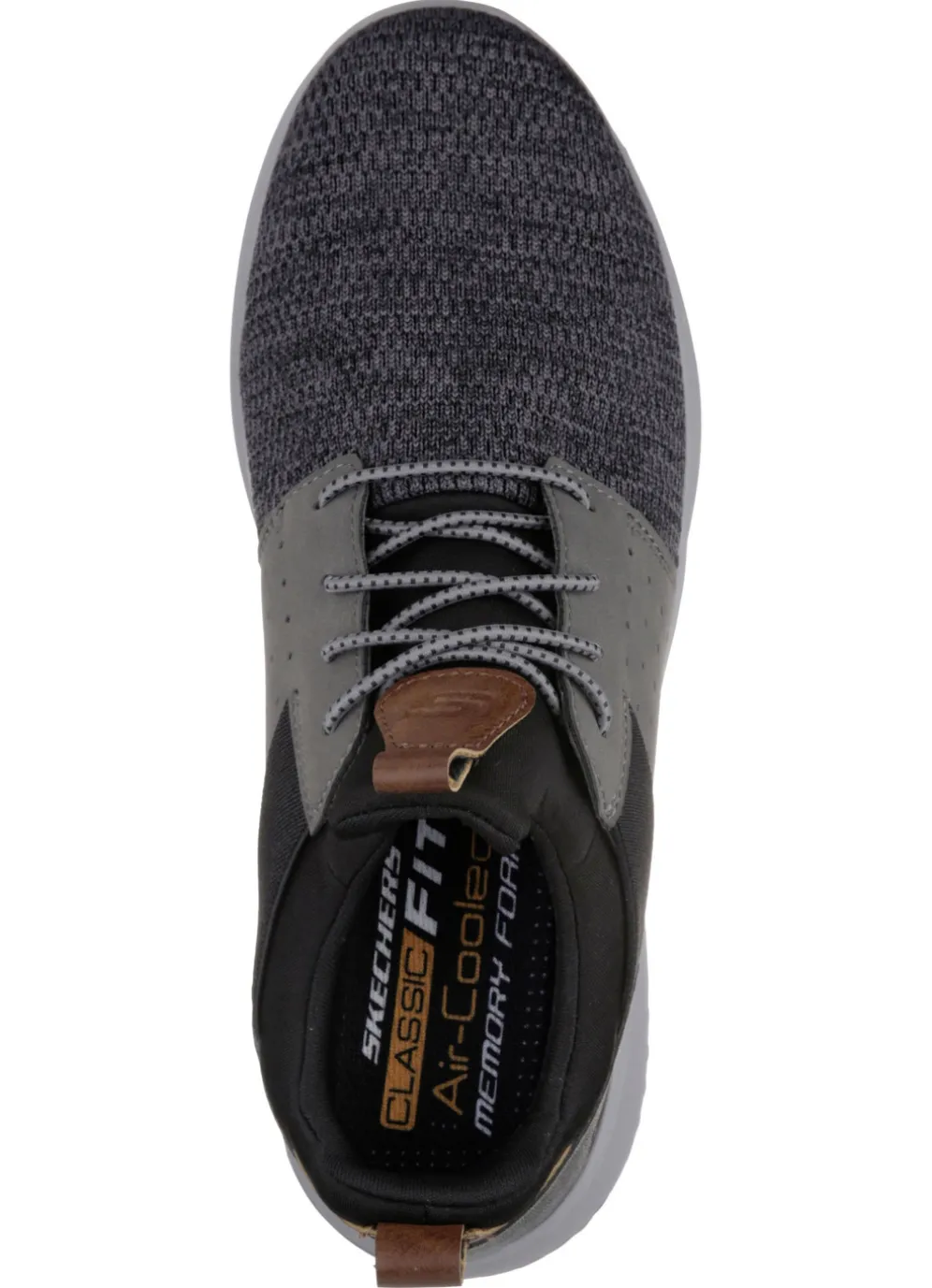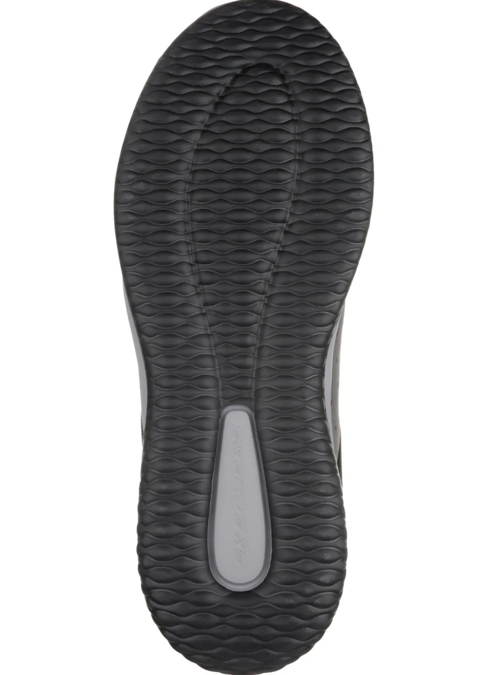 SKECHERS, leichte Herren-Slipper, mit elastischer Zierschnürung in Grau-Schwarz und in Größe 45.
