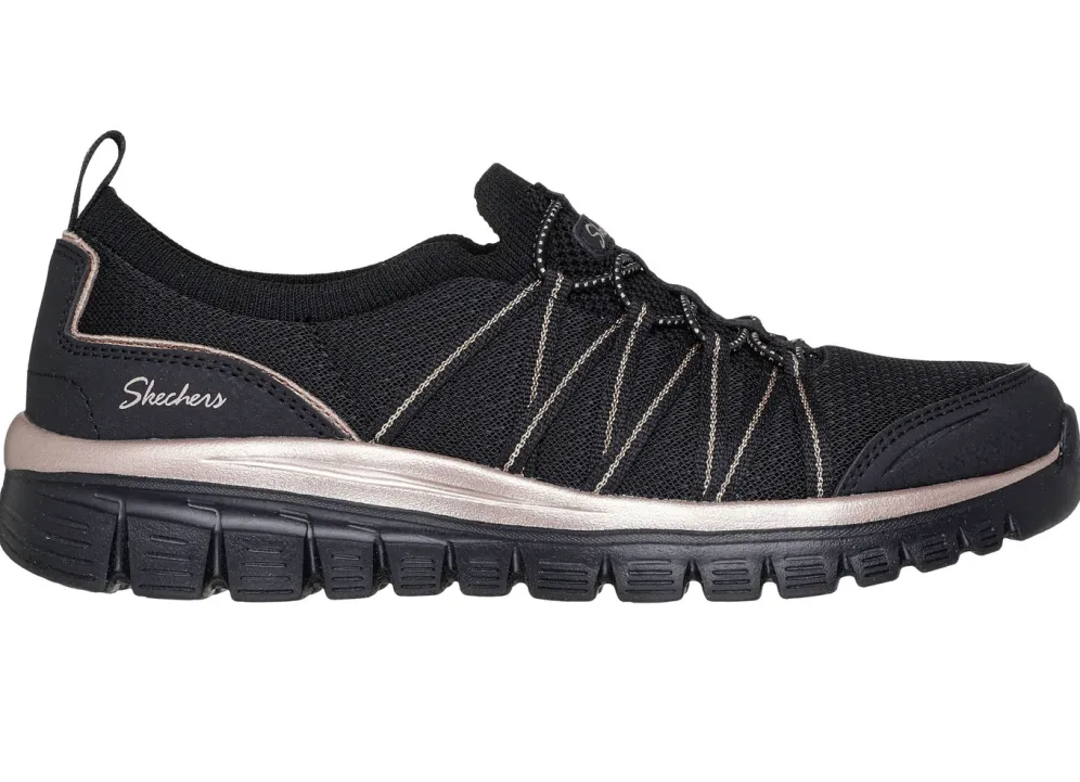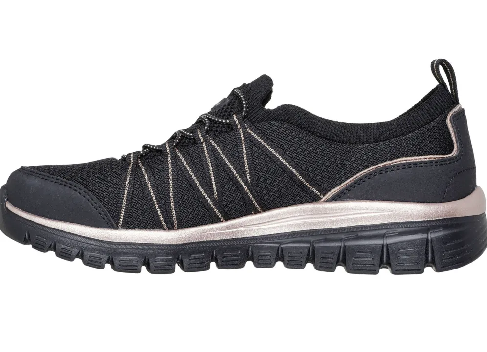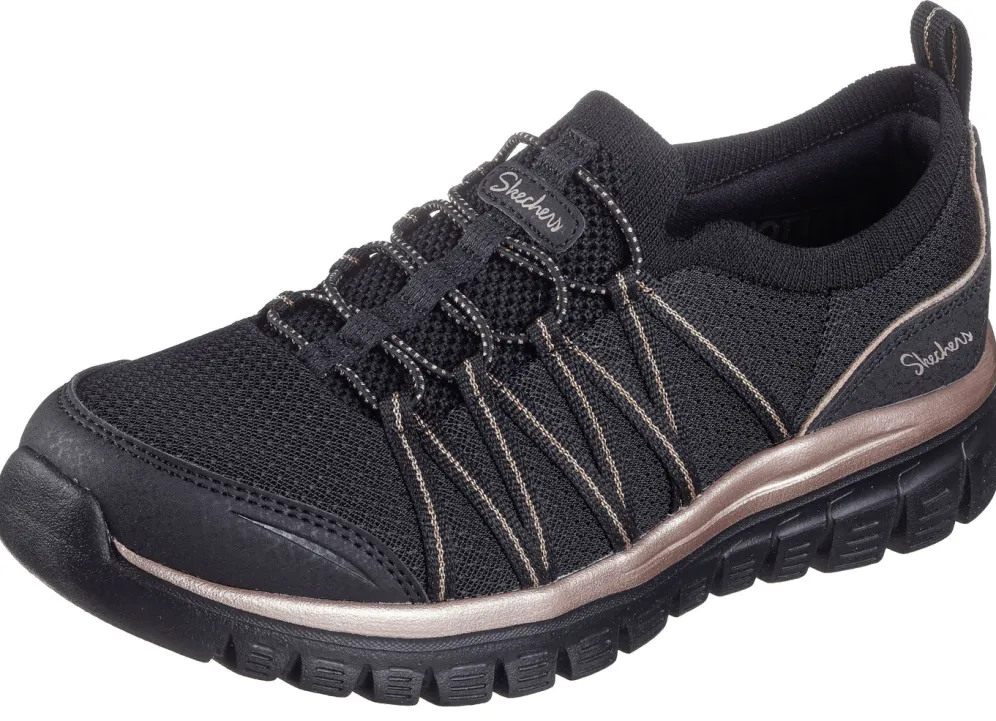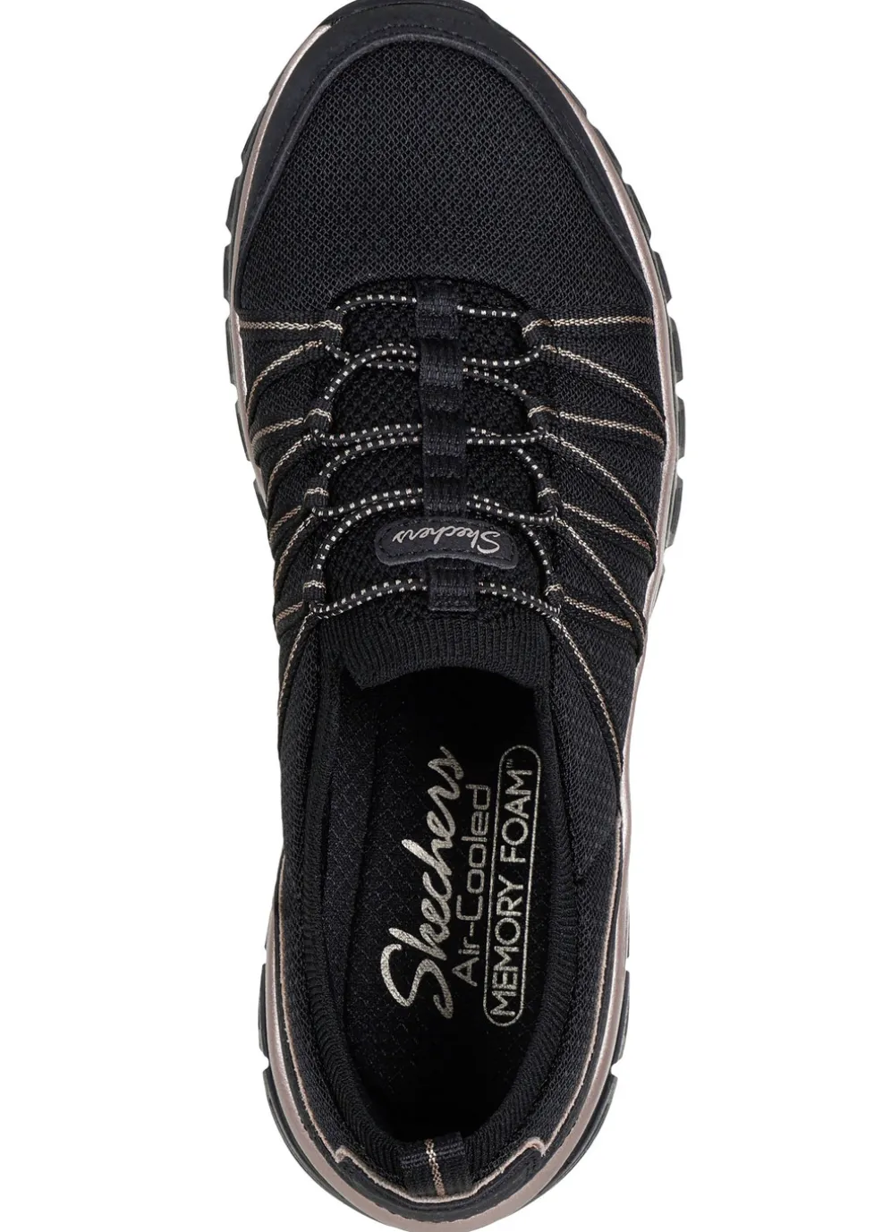 SKECHERS, trendige Damen-Slipper, aus gestricktem Mesh-Material in Schwarz-Roségold und in Größe 41.