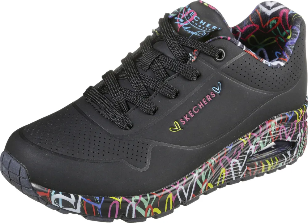 Sneaker aus Synthetik, teilweise mit bunten Herzen bedruckt: Schnürung, Zier-Perforation, Textilfutter, gepolsterte Decksohle, 20 mm Plateau-Profilsohle mit sichtbarem Luftpolster, 40 mm Keil
