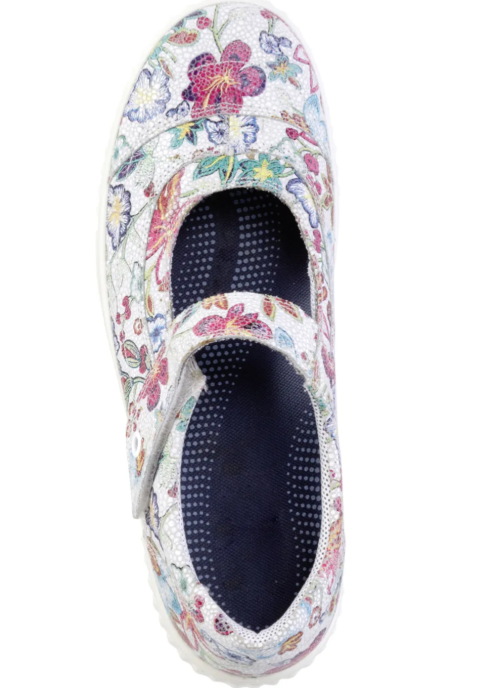 Slipper in Ecru-Bunt aus floral bedrucktem Leder, mit verstellbarer Klettspange: Weite H, verdeckter Gummizug, Textilfutter, herausnehmbares Fußbett, leichte PUR-Laufsohle sowie 10 mm Keilabsatz
