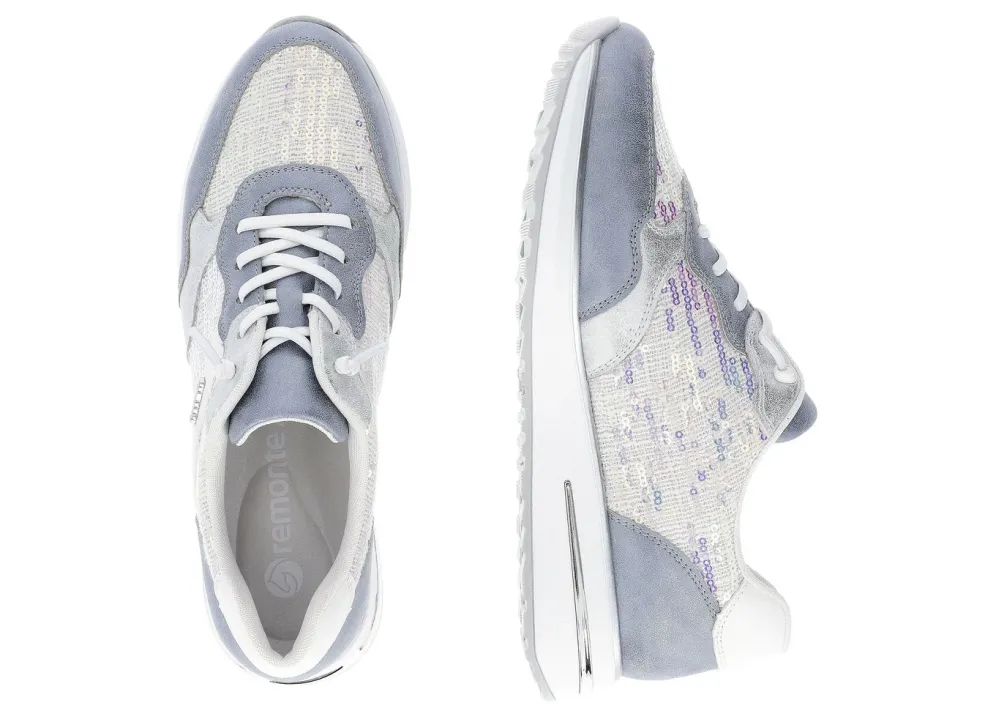 Sneaker in Bleu-Weiß aus interessant geprägtem Materialmix, teilweise mit schimmernden Pailletten besetzt: Schnürung, Textilfutter, herausnehmbares Fußbett, leichte TR-Profilsohle sowie 20 mm Keilabsatz
