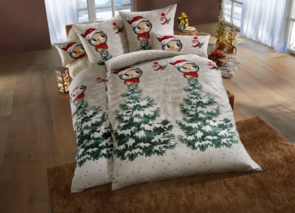 Eine süße Eule auf einer verschneiten Tanne präsentiert sich zusammen mit anderen Vögelchen auf dieser winterlichen Garnitur von „Florella“. Mit praktischem Reißverschluss. Die kuschelige Qualität: Soft-Biber aus 100% Baumwolle. Waschbar bis 60 °C und trocknergeeignet.