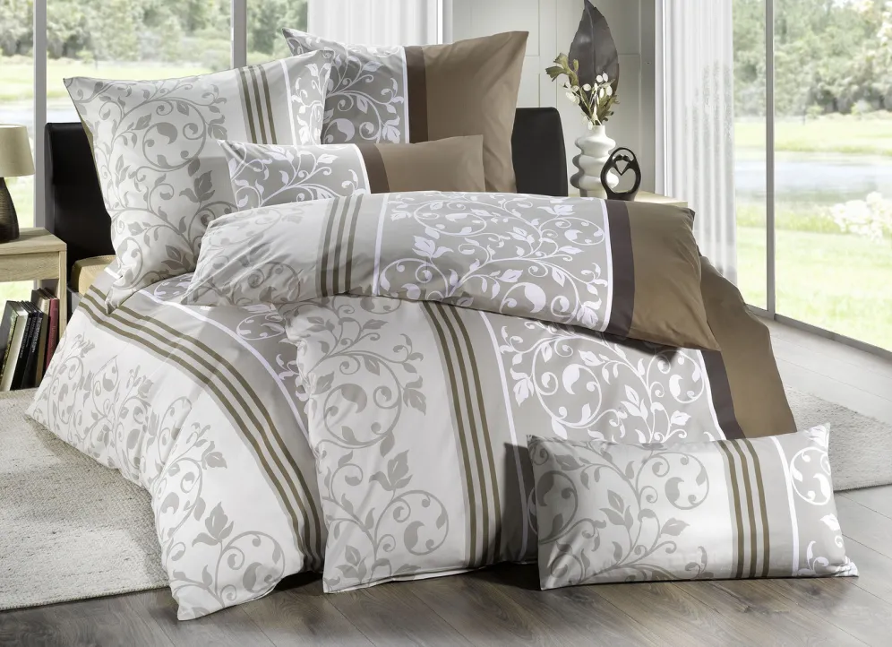 Soft-Renforcé Bettwäsche-Garnitur von Florella in Größe 111 (40×80 cm + 135×200 cm) und in Beige.