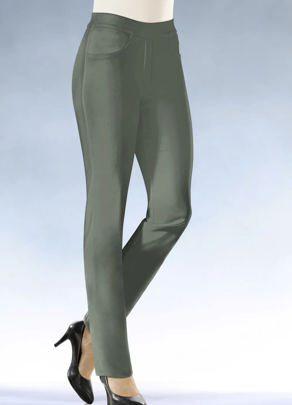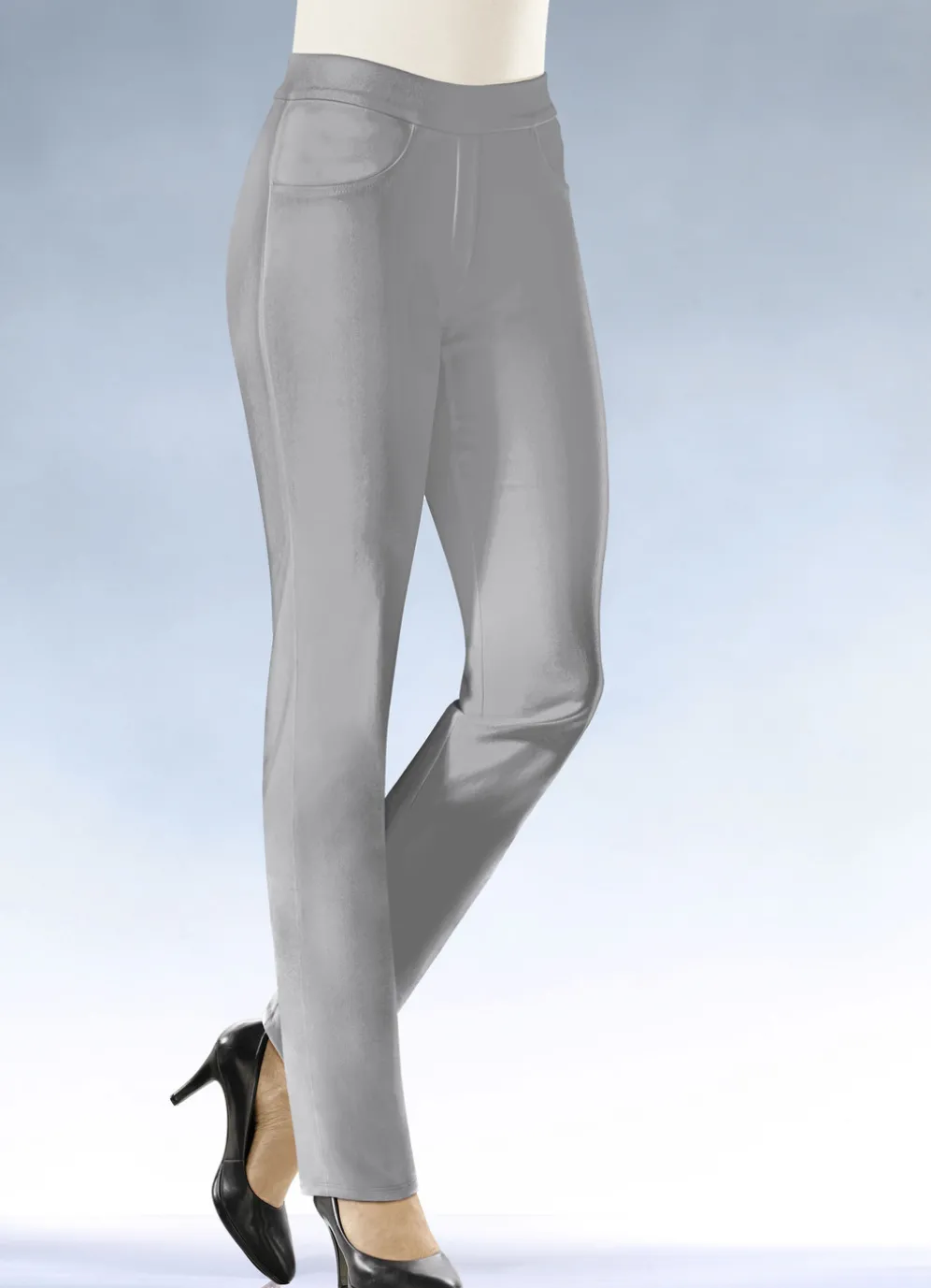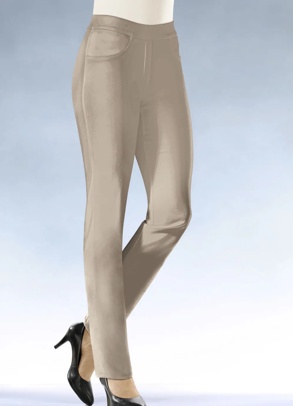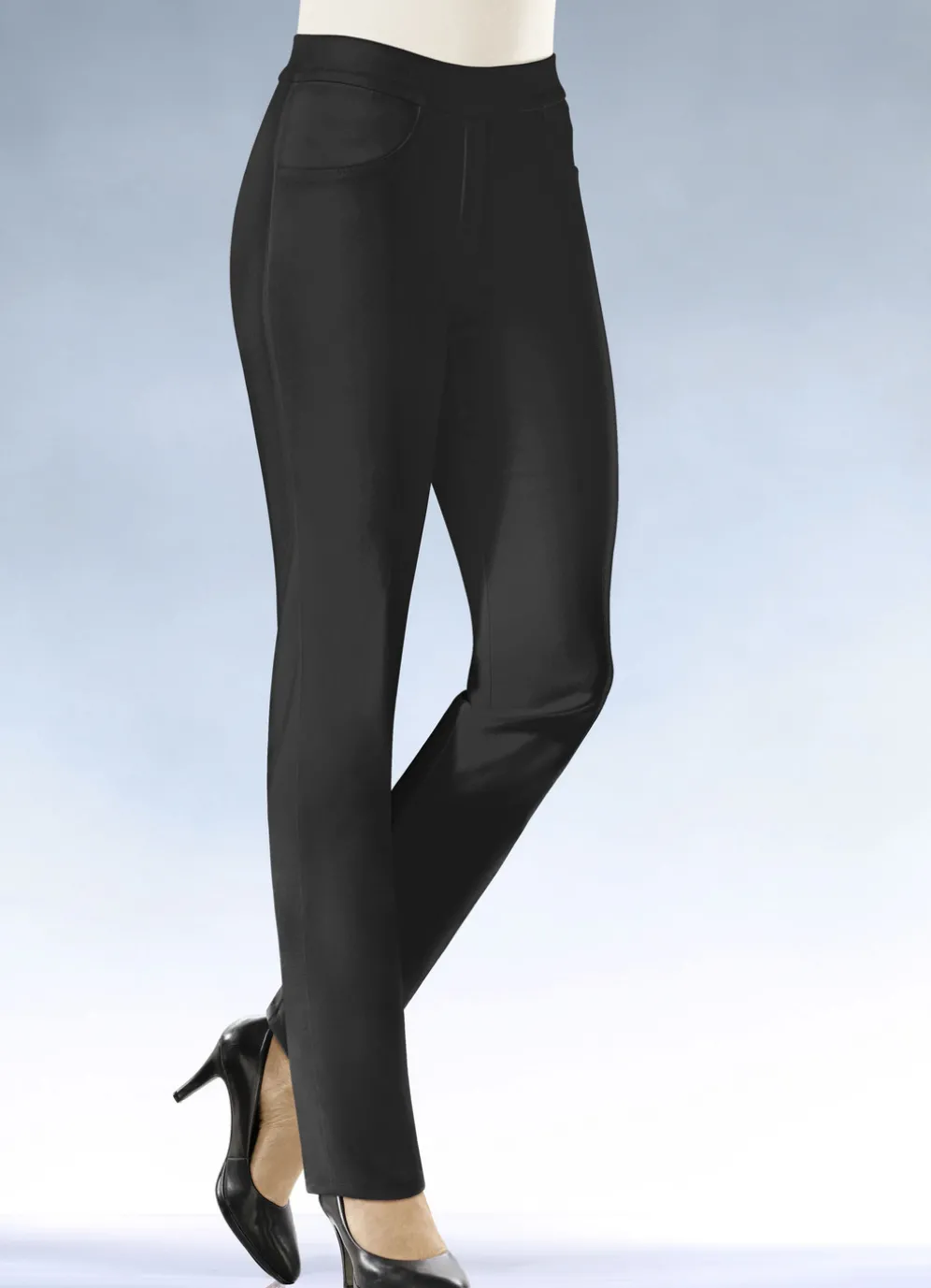 Ihr Modell BECKY – schicke Soft-Stretch-Hose in komfortabler Schlupfform, glatt anliegend dank des innenliegenden, unsichtbaren Rundum-Dehnbundes, vordere Reißverschluss-Zierblende sowie Seitentaschen. Für optimale Passform eine Größe kleiner bestellen! Innenbeinlänge ca. 78 cm, Fußweite ab 36 cm.