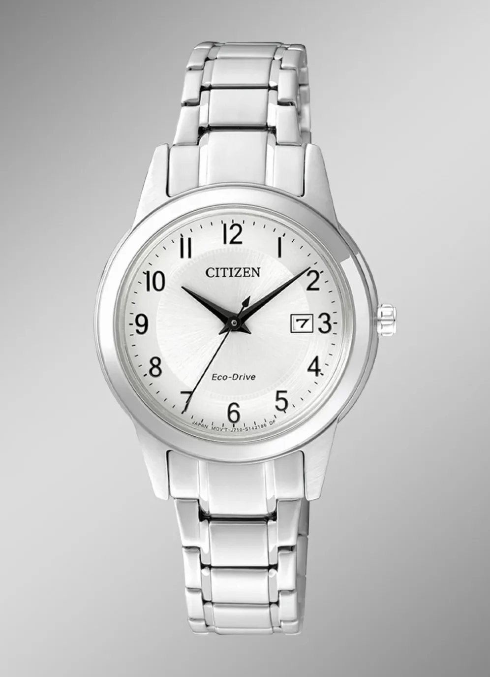 Klassische Solar-Damenuhr mit einem Edelstahlbandgehäuse mit Sicherheitsfaltschließe und Kristallglas. Die Damenuhr hat auch einiges zu bieten: 240 Tage Gangreserve, Batterie-Entladungsanzeige, Datums-Anzeige, Ring Solar und Eco Drive.