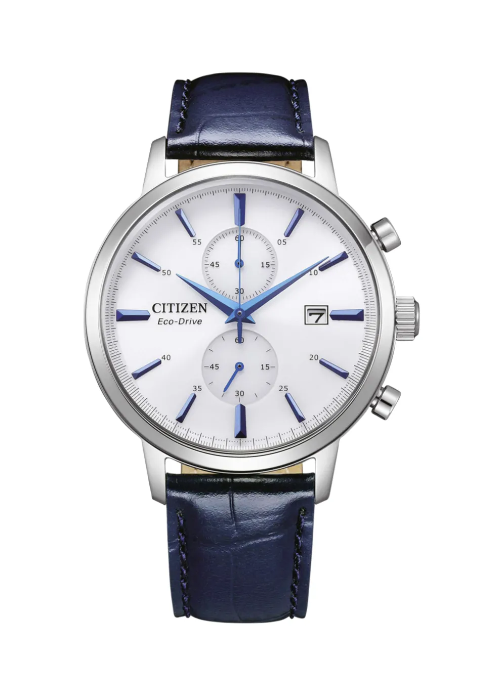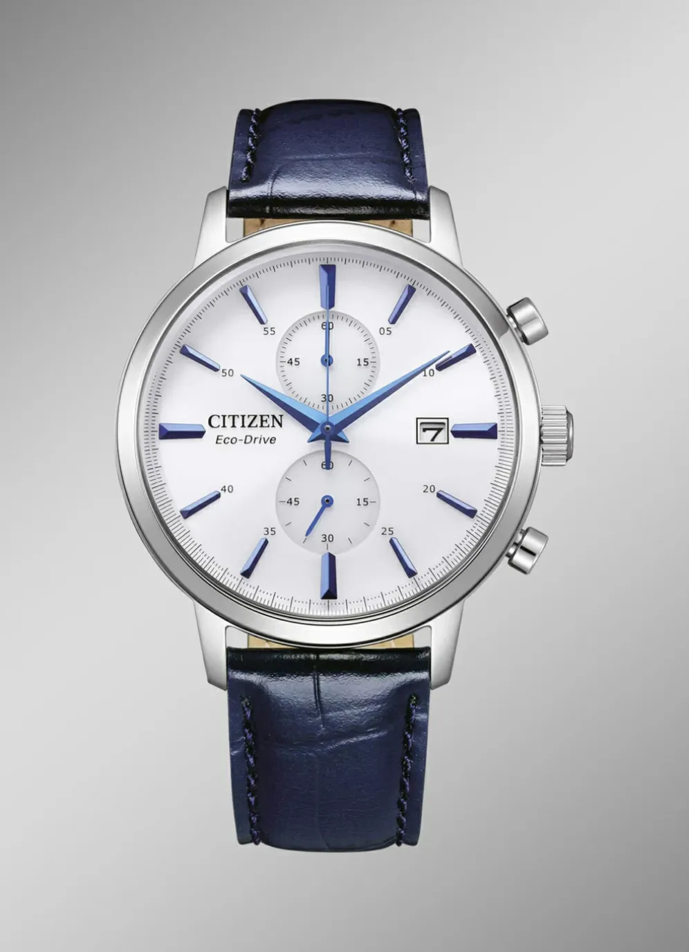 Citizen CA7069-16A Der sportliche Solar-Herrenchronograph hat ein Edelstahlgehäuse, ein blaues Lederband mit Dornschließe und Kristallglas. Als Highlight hat die Uhr ein grünes Zifferblatt, dass sich gut ablesen. Als Features hat die Herrenuhr eine Stoppuhr, eine Datums-Anzeige, eine Batterie-Entladungsanzeige und 210 Tage Gangreserve. Die Technologie „Eco Drive“ aus dem Hause Citizen kann aus jeder Lichtquelle Energie erzeugen und macht Batteriewechsel überflüssig. Die Herrenuhr ist 5 bar wasserdicht und hat einen Gehäusedurchmesser von 42 mm.