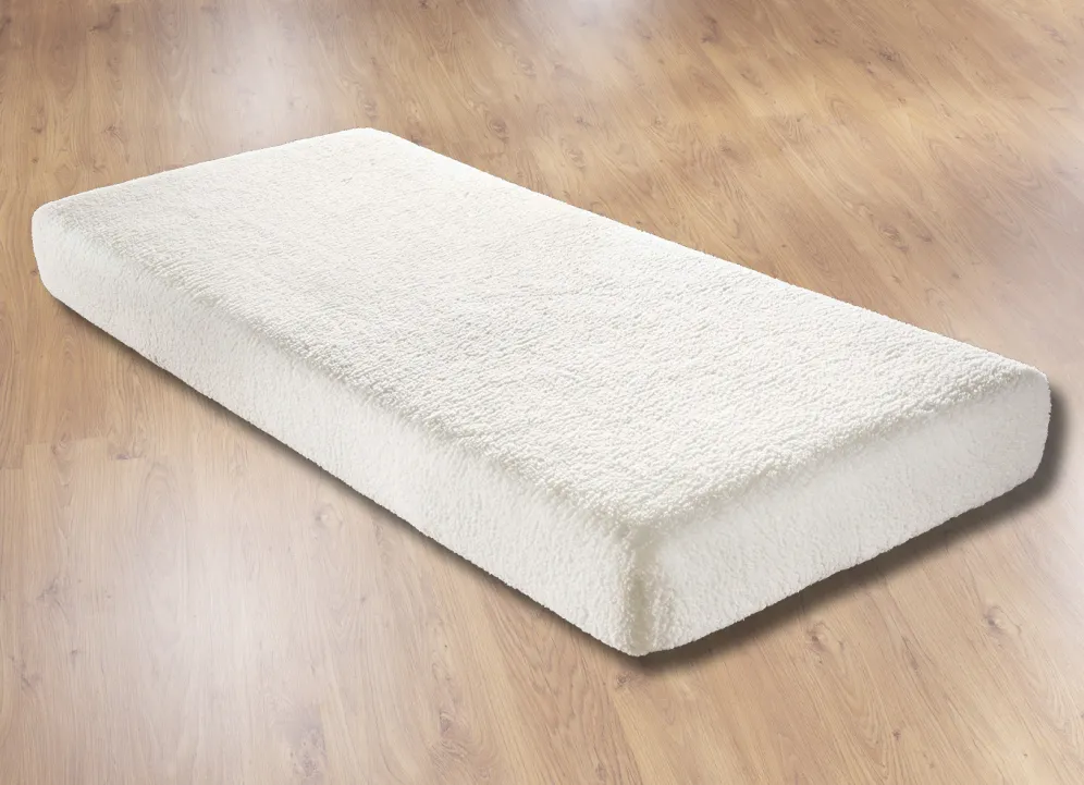 Spannbetttuch mit Sherpa-Teddy-Plüsch für kuschelig warme Nächte in Größe 133 (90–100/200 cm) und in Wollweiss.