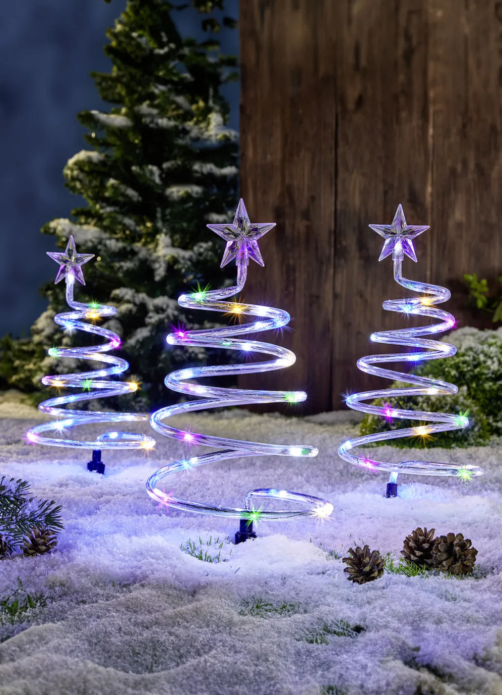 kommt auch in der dunklen Jahreszeit stets gute Laune auf. Je 20 LED´s lassen die Bäumchen in Regenbogen-Farben oder klassisch weiß erstrahlen. Ob im Garten, dem Balkon oder im Blumenkasten, als moderne Interpretation des klassischen Weihnachtsbaumes bringen Sie einen Hauch von Magie in Ihren Außenbereich. Mit Timerfunktion. Aus Phenoplaste und Polyvinylchlorid. Maße: Gesamthöhe inkl. Spieß: 57cm, Abstand zwischen den Tannen: 58cm, Zuleitung: 55cm.