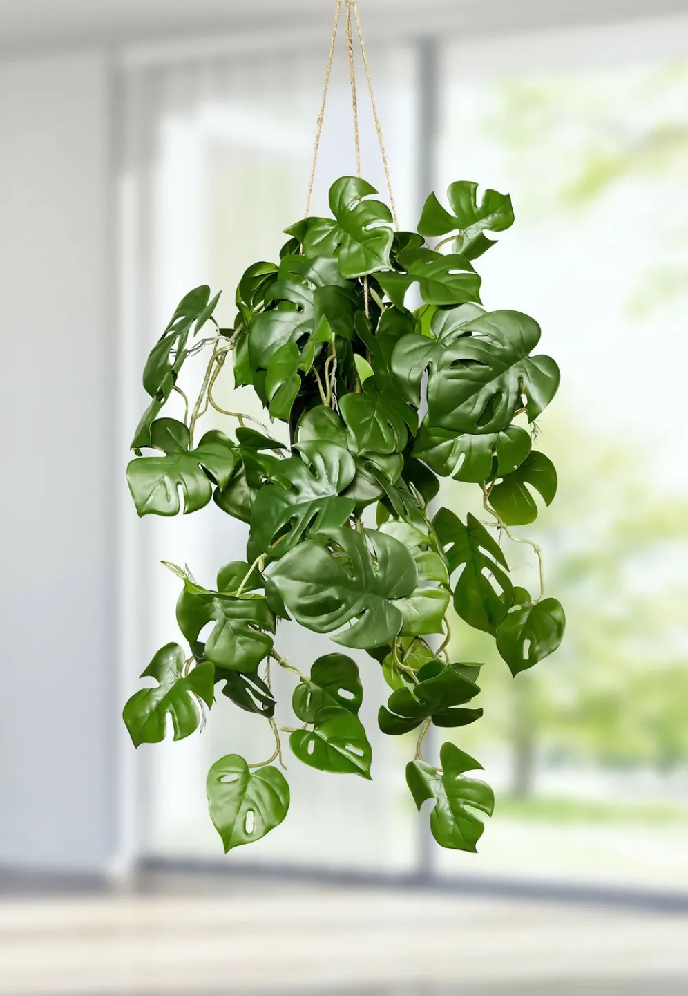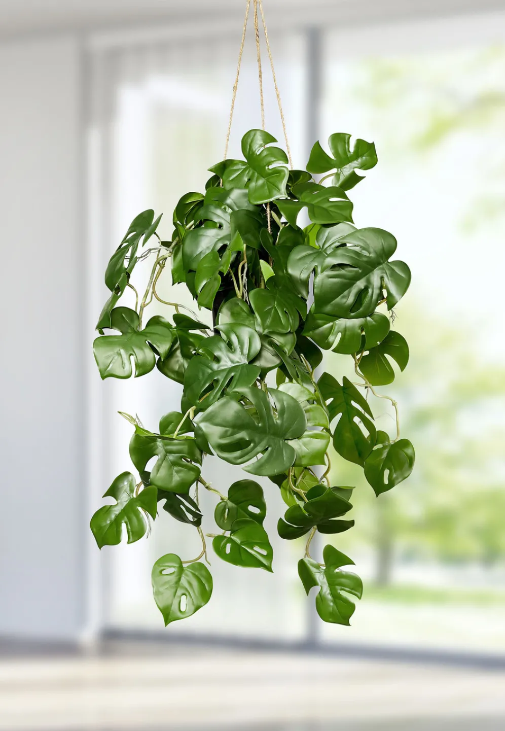 Diese naturgetreue Splitphilo-Ranke wurde fest in einen schwarzen Kunststofftopf eingesetzt. Mit praktischer Aufhängung aus Sisal. Aus hochwertigem Kunst- und Textilmaterial hergestellt.