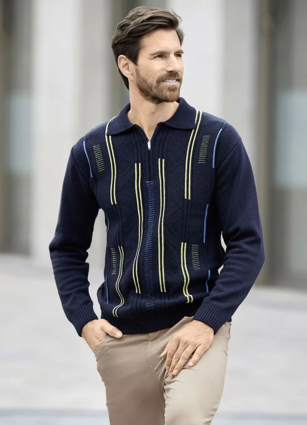 Mit tollem Strukturdessin in Gelb und Blau und Reißverschluss im Vorderteil, zeigt sich dieser sportive, marinefarbene Polopullover mit Rippenstrick-Abschlüssen.
