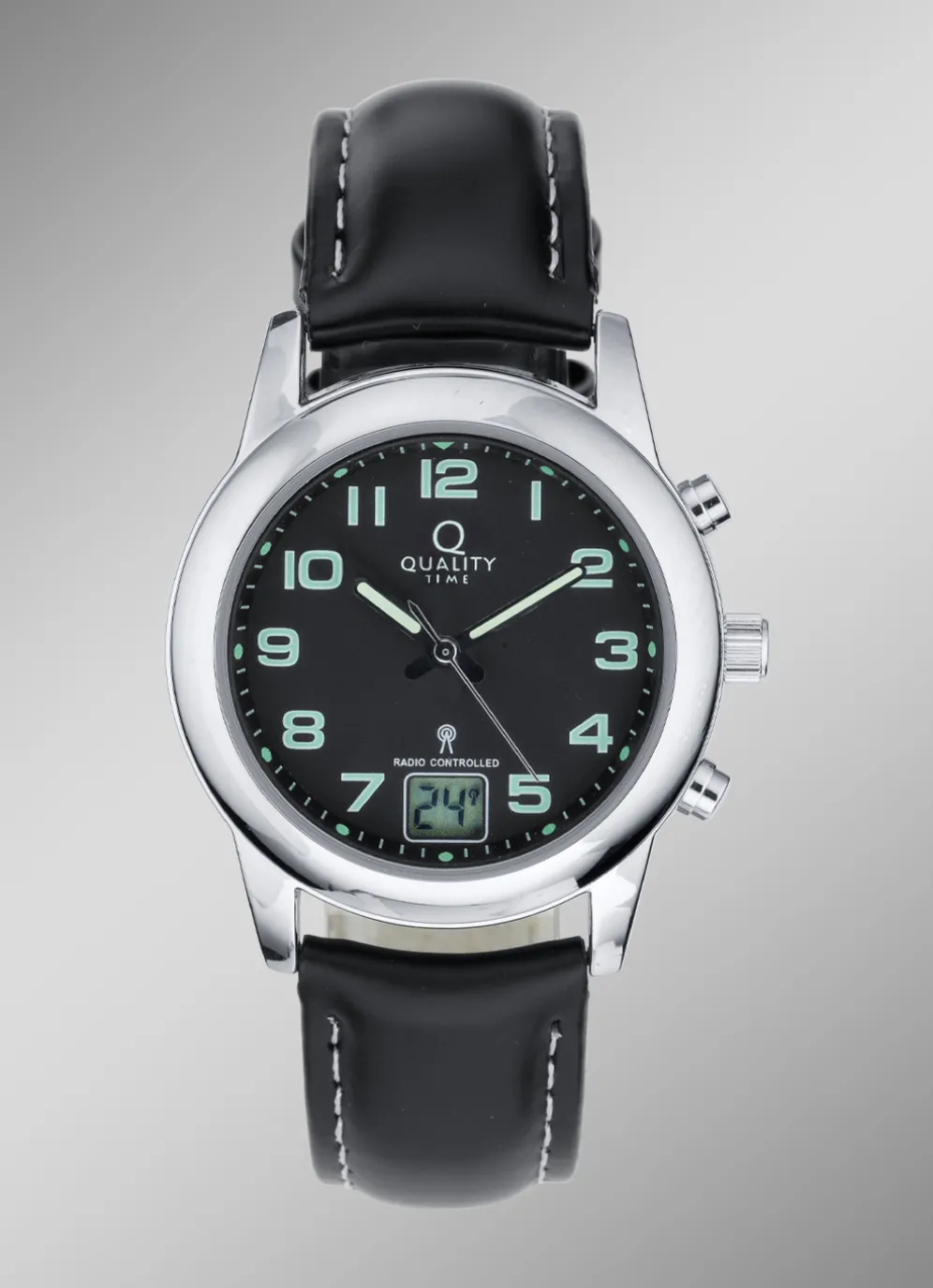 Sportliche Funk-Damenuhr der Marke Quality Time mit Gehäuse aus Metall und mit einem Uhrenband aus Leder.
