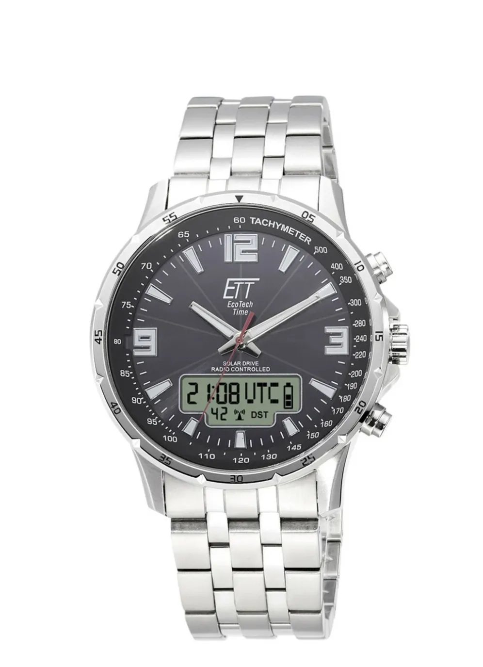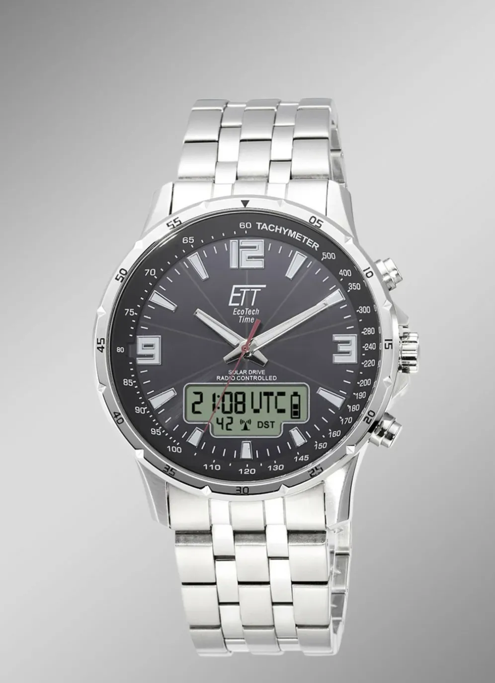 Sportliche, elegante Herrenuhr, funkgesteuert und mit Solar Antrieb. Das Gehäuse und Armband sind aus robustem, massivem Edelstahl. Die Zifferblattfarbe ist schwarz. Diese Multifunktionsuhr besitzt unter anderem eine World Timer Funktion, mit abrufbaren Uhrzeiten von 38 internationalen Städten. Die Datumsanzeige ist sehr gut ablesbar (Big Date mit Tag / Wochentag), dass Zifferblatt ist durch Knopfdruck beleuchtbar. Wasserdicht ist die Uhr bis 10 bar.
