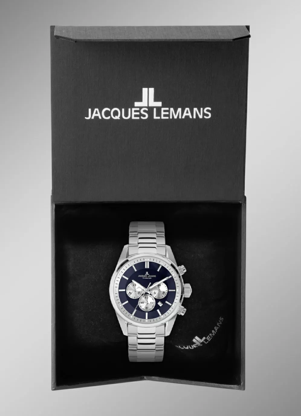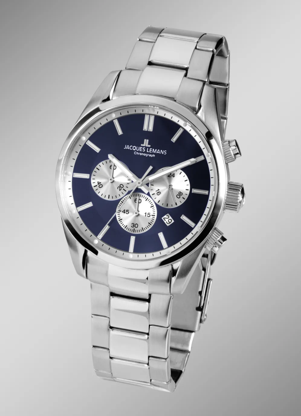 Das Band aus massiv Edelstahl mit Sicherheitsfaltschließe rundet den edlen Look perfekt ab – dieser Chronograph ist ein markanter Zeitmesser, der seine Wirkung immer behalten wird.