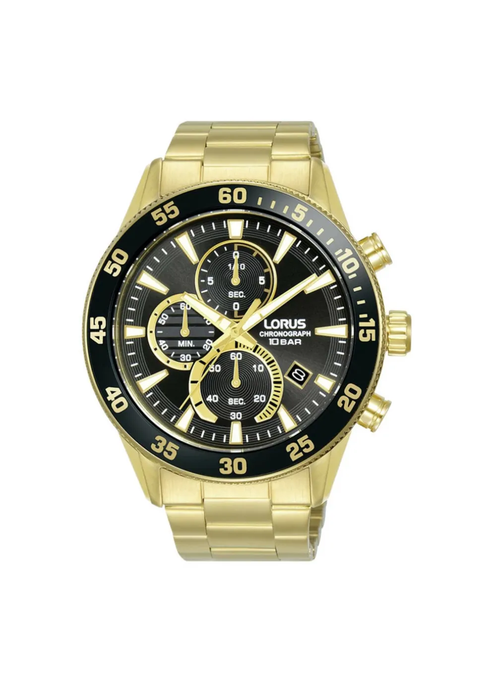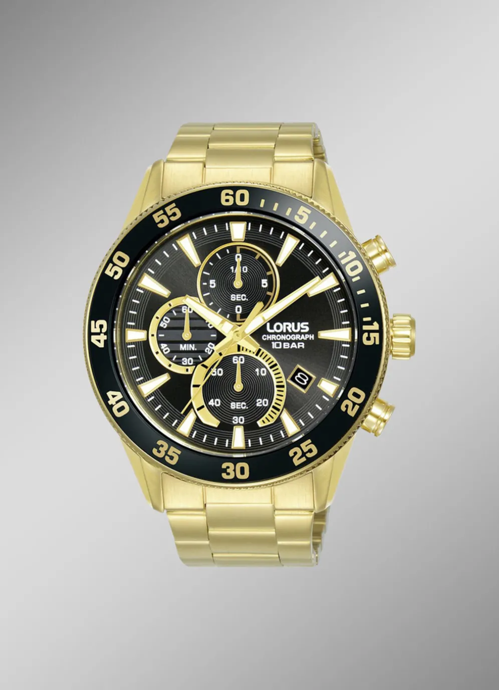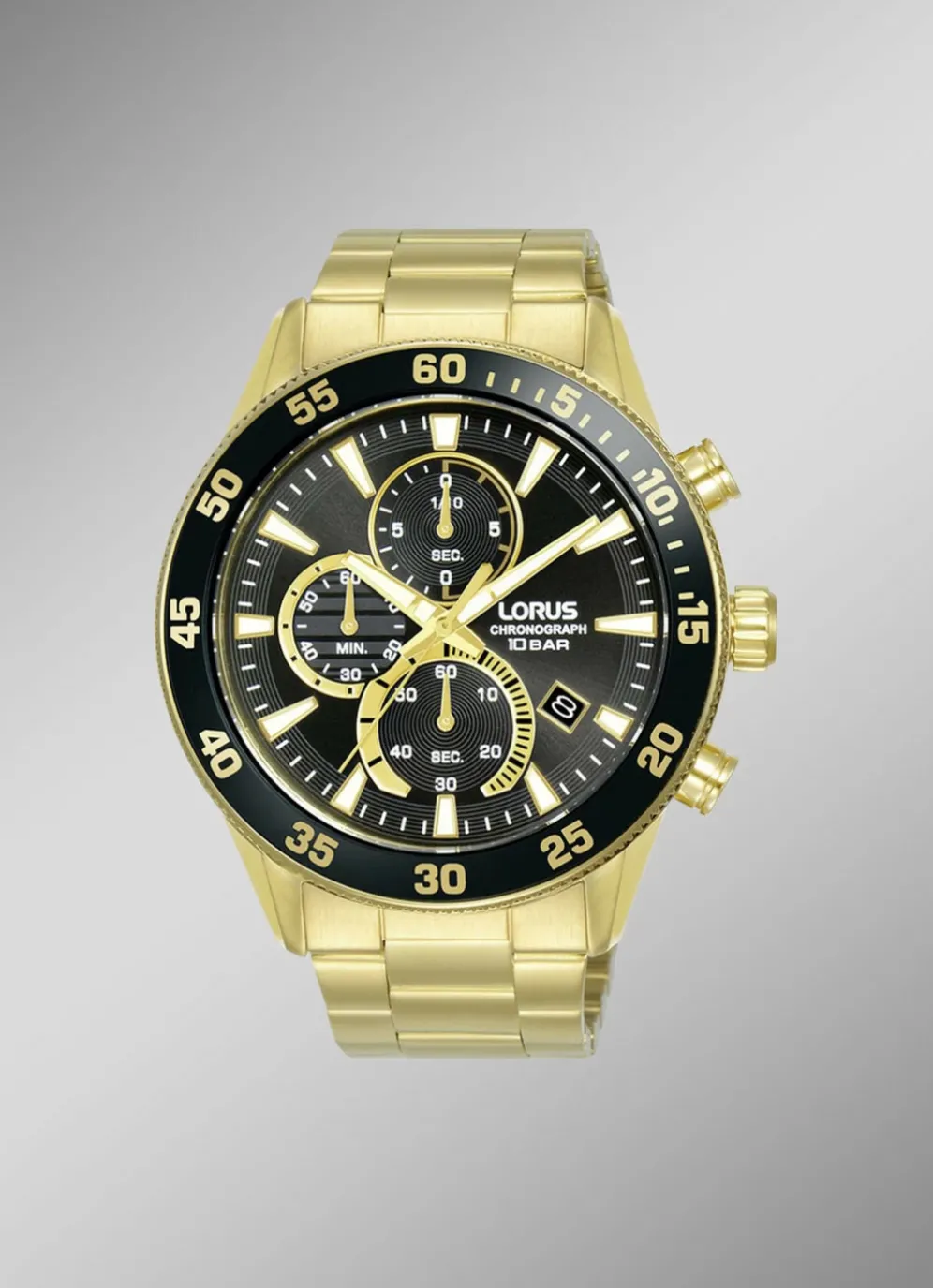 Sportlicher Quartz-Herren-Chronograph der Marke Lorus. Die Herrenuhr hat ein goldfarbenes Edelstahlbandgehäuse mit Sicherheitsfaltschließe und Mineralglas. Durch die vorhandenen Leuchtzeiger kann die Uhrzeit im Dunkeln besser abgelesen werden. Zudem gibt es eine Datumsanzeige, eine Stoppuhr und einen Tachymeter. Die Herrenuhr ist 10 bar wasserdicht und hat einen Gehäusedurchmesser von 45 mm.