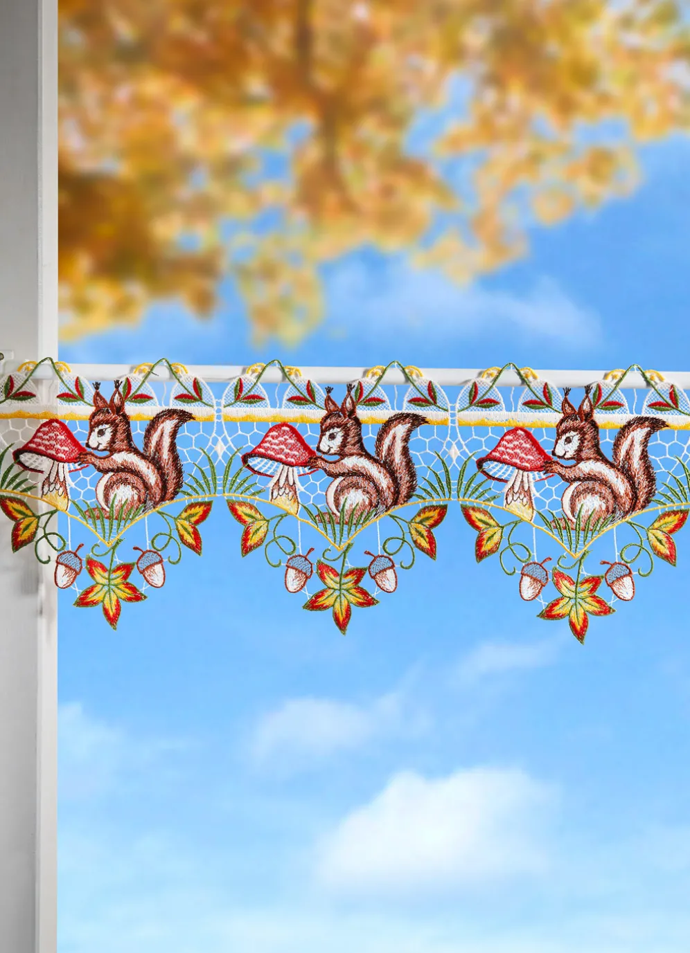 Setzen Sie herbstliche Akzente in Ihrem Zuhause mit dieser stimmungsvollen Stangendeko Eichhörnchen. Aus echter Plauener Spitze gefertigt und mit Stangendurchzug ausgestattet. Die Qualität: 100% Polyester