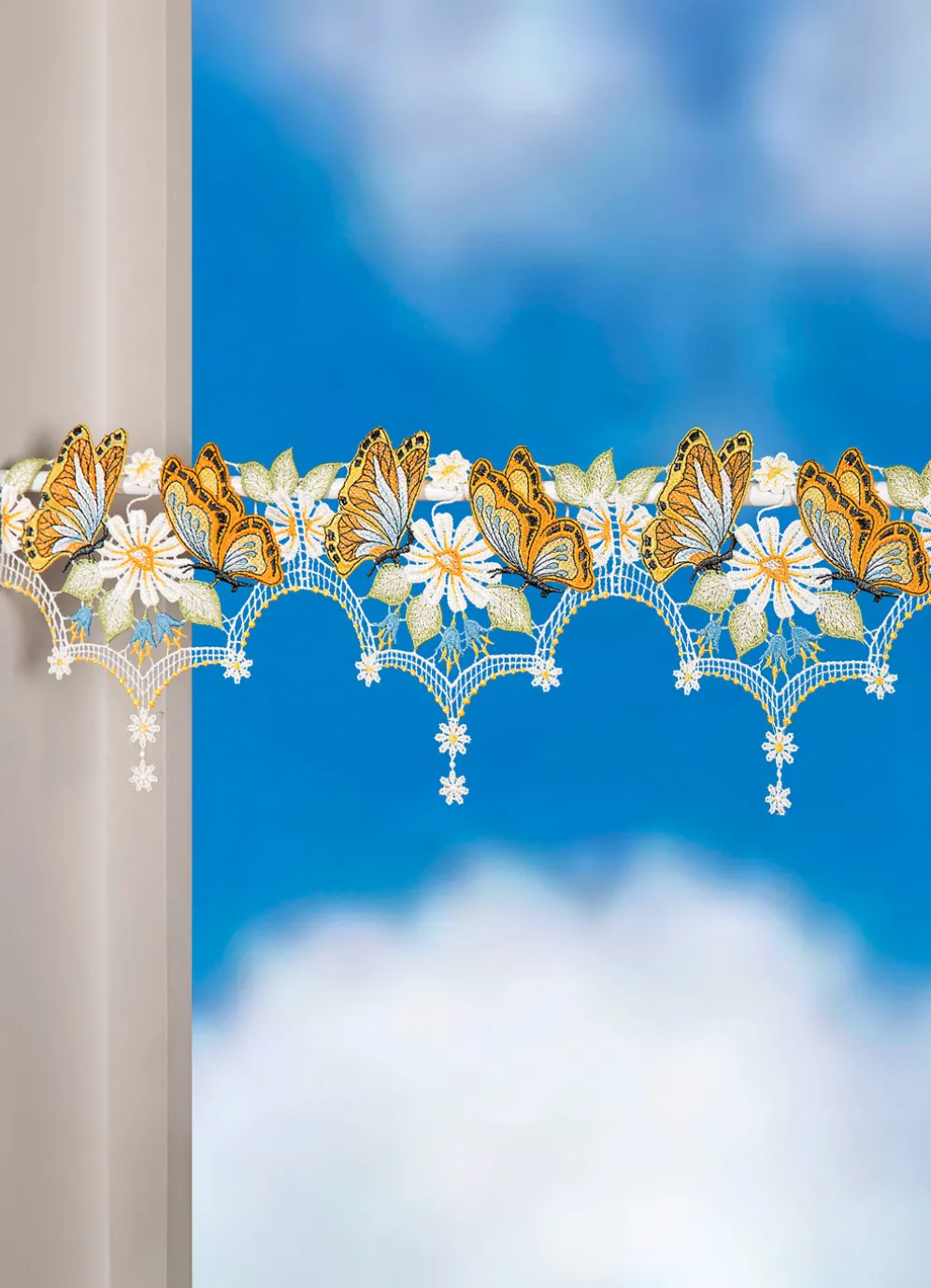 Die herrlich bunten Schmetterlinge auf dieser tollen Stangendekoration aus echter Plauener Spitze möchten mit Ihnen den Frühling begrüßen. Mit Stangendurchzug ausgestattet.