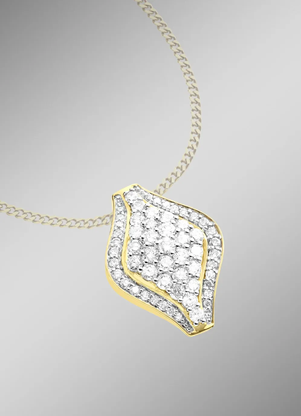 Dieser wunderschöne, stark ausgefasste Anhänger mit 57 Brillanten, zusammen 1,00 ct., Weiß, Piqué 1, eignet sich gut als Geschenk. Das in hochwertiger Handarbeit gefertigte Schmuckstück aus Gold 585/- fein ist seitlich verziert und mit einer verdeckten Öse gearbeitet. Die Maße betragen 20×14 mm.