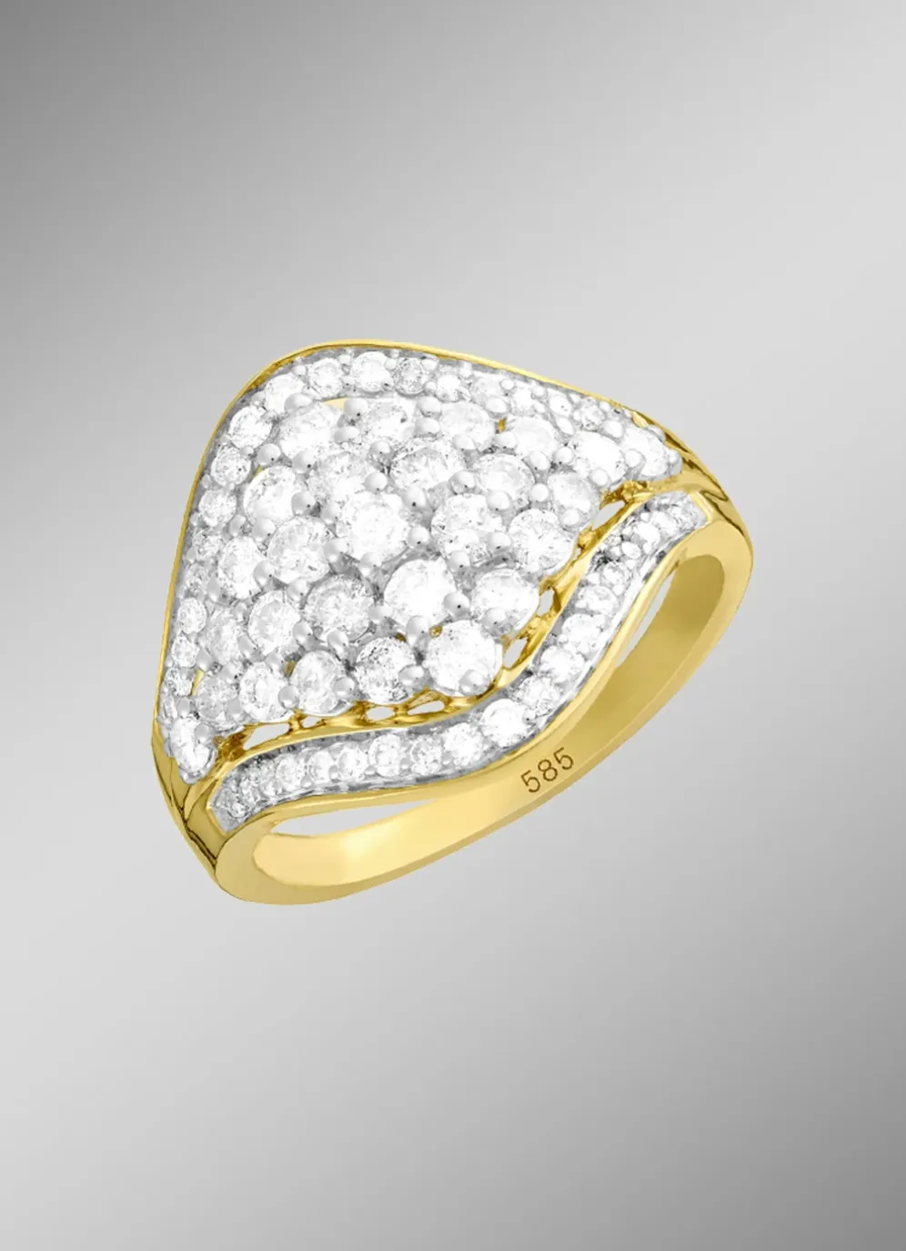 Ein faszinierendes Feuerwerk der Brillanten zeigt dieser stark ausgefasste Damenring mit 65 Brillanten, zusammen 1,40 ct., Weiß, Piqué 1. Das Schmuckstück aus Gold 585/- fein wurde in hochwertiger Handarbeit gefertigt. Der Ringkopf hat einen Durchmesser von 12 mm.