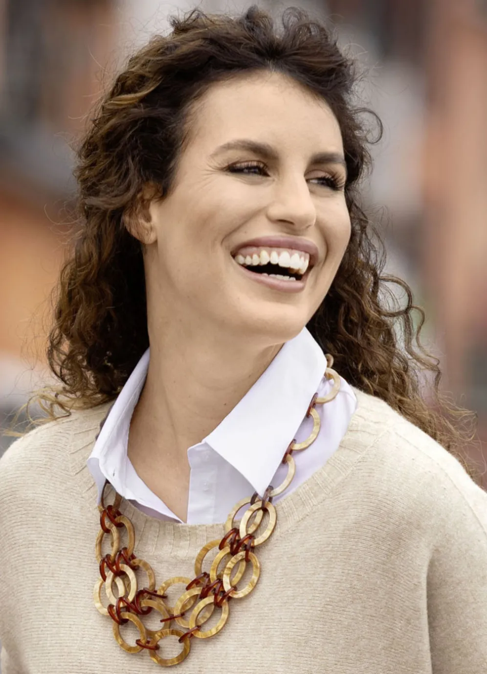 Statement-Kette Mix aus cremefarbenen und rotbraunen Gliedern 3-reihig Große, ineinander verflochtene Ringe Breite ca. 15-26mm Länge: 60 cm und 5 cm Verlängerung Goldfarbener Karabiner