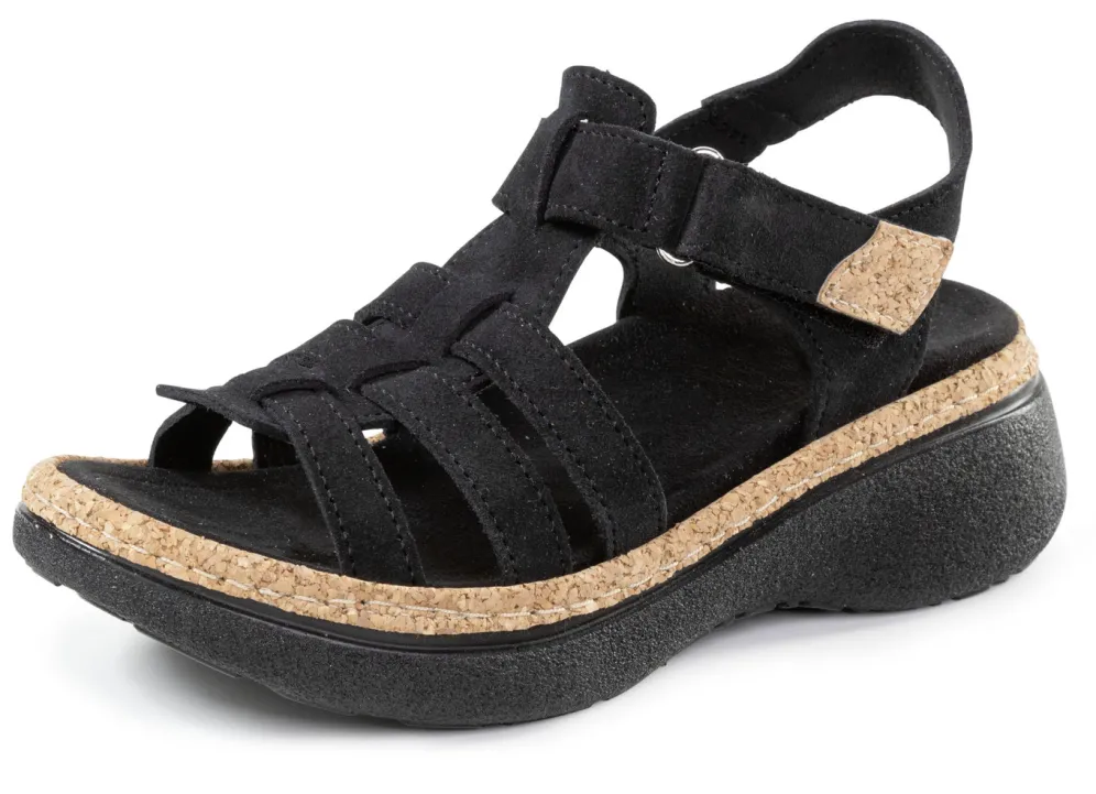 Stegspangen-Sandale aus Veloursleder, in Weiß aus Nappaleder, mit Kork-Besätzen und verstellbarer Klettspange: herausnehmbares Fußbett, leichte PU-Profilsohle mit 30 mm Plateau und 50 mm Keil