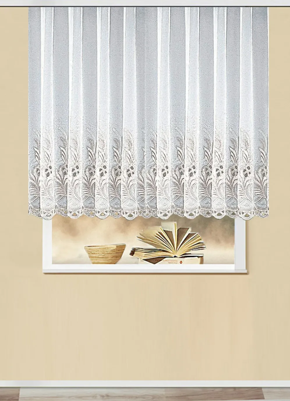 Stickerei-Store in gerader Form mit Plauener Stickerei in Größe 065 (H125xB300 cm) und in Weiss.