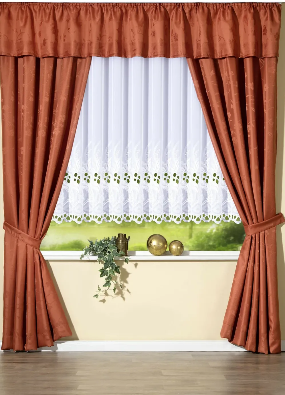 Stickerei-Store in gerader Form, mit hochwertiger Plauener Stickerei und Universalschienenband. Die Qualität: Voile aus 100% Polyester.