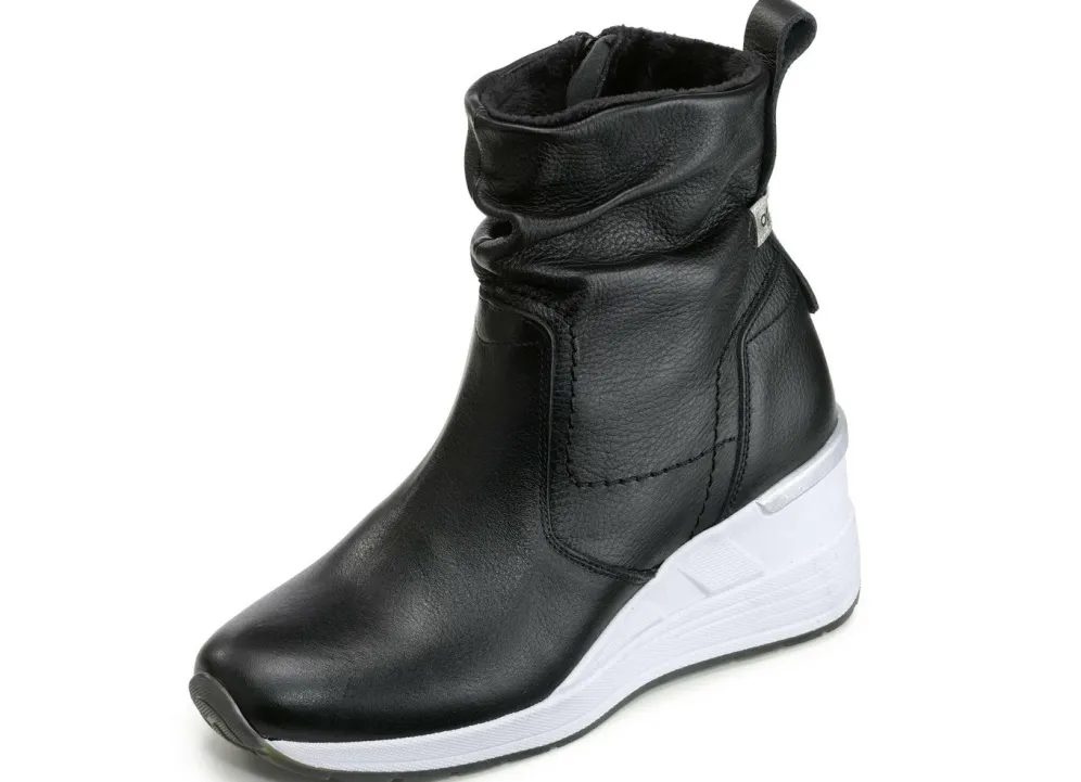 Modische Stiefelette aus weichem Nappaleder: in Weite H, Innenreißverschluss, wärmendes Futter aus 100% Polyester, herausnehmbares Fußbett, leichte TR-Laufsohle sowie 50 mm Keilabsatz. Schafthöhe ca. 16 cm