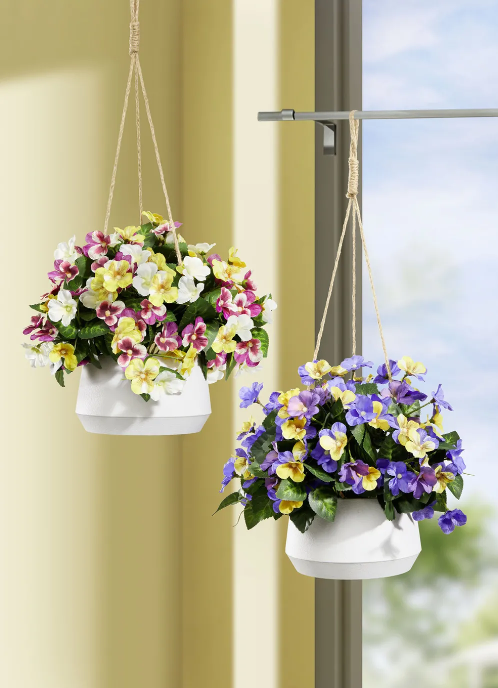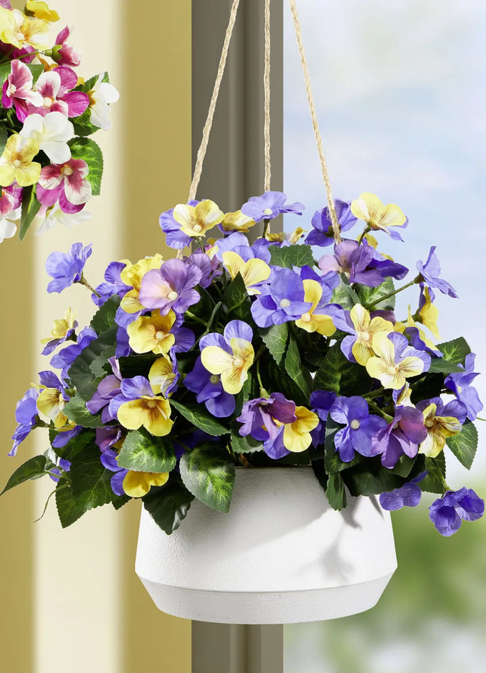 Stiefmütterchen in Hängeampel in Gelb-Violett.