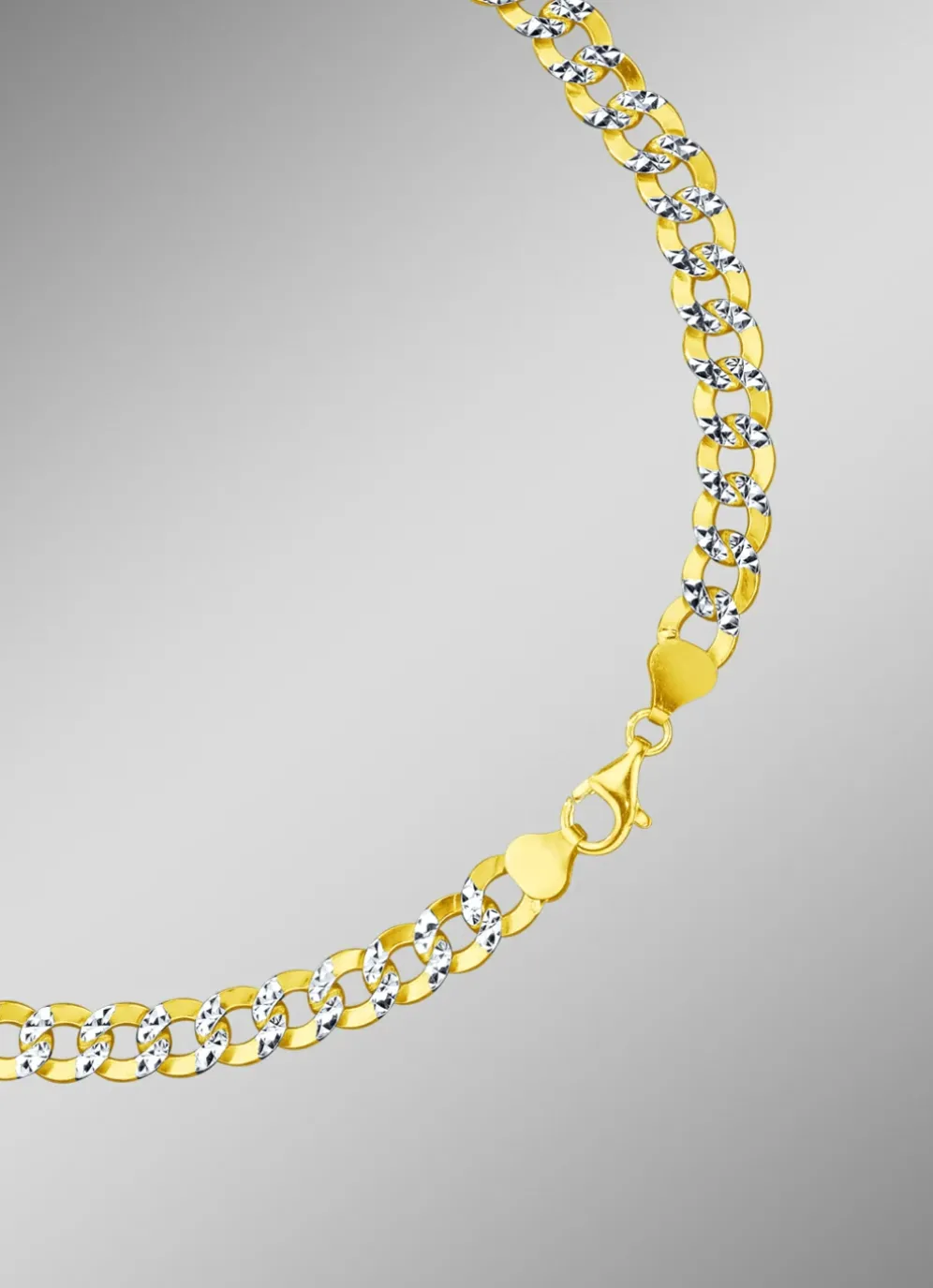 Diese bezaubernde, diamantierte Panzerketten-Garnitur in Bicolor ist ein hervorragendes Accessoire für jeden Mann. Das vollmassive Schmuckstück aus Silber 925/- fein, 14 Karat vergoldet, ist 8 mm stark. Mit Karabinerverschluss.