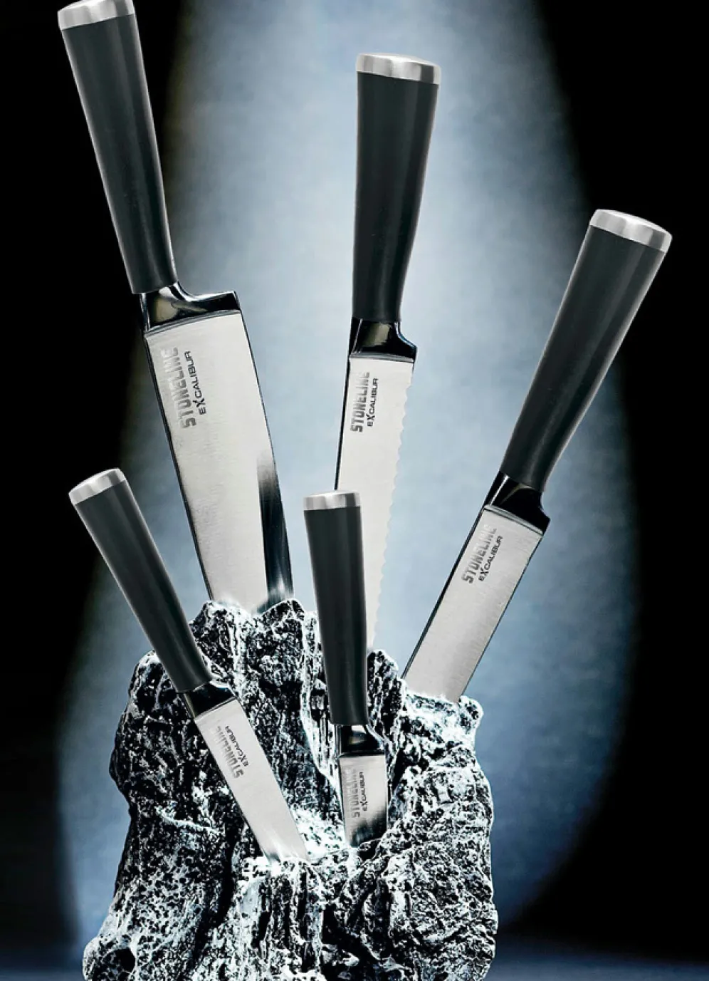 Stoneline® Excalibur® Messerblock mit 5 Edelstahlmessern. Konisch geschliffene Präzisionsklingen aus hochwertigem, gehärtetem Edelstahl. Hohe Schneidfähigkeit und lang anhaltende Schärfe. Messerblock in Felsform aus Resin.